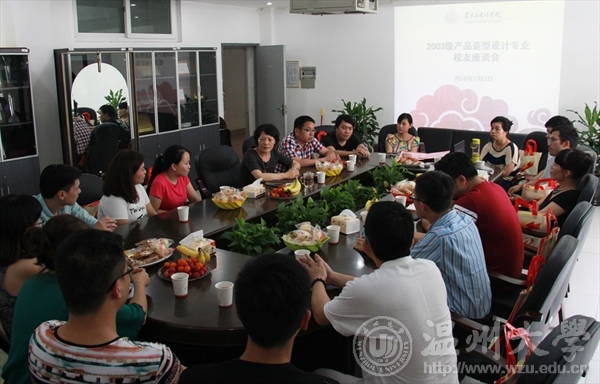 2003级产品设计班本次共有13位同学到会。他们在紧张忙碌的生活中克服重重困难从天南海北赶到温州母校重聚。座谈会上,员工们畅所欲言会场上欢声笑语不断,大家介绍了各自目前的工作、生活状态也纷纷表达了对母校的怀念之情和对老师们当年悉心教导的感激之情。