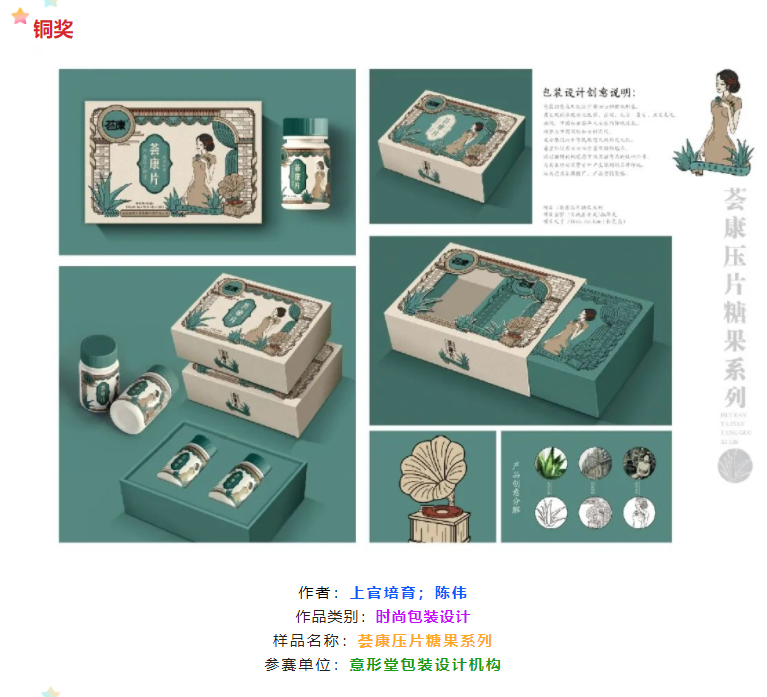 在去年的比赛中,“意形堂”投稿的荟康芦荟压片糖果高端礼盒成功拿下铜奖。据了解,该包装受山西澳意芦荟生物科技有限公司委托,荟康系列产品的特性就是专为女性而研发,关注女性健康。上官培育告诉记者,该包装创意采用女士着旗袍的形象,不仅展现出了中华传统文化的魅力,也着重体现了东方女性的优雅大方。这种独特的视觉感官及其强有力的设计符号,能够在终端消费者中产生深刻的品牌印记,从而达成品牌推广、产品营销策略。据悉,目前该产品包装已生产约10万套,产值估计在1000万元左右。