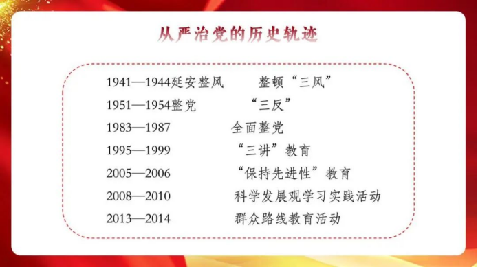 从1941年开始,我党就开始从严治党。学姐带我们解读了从严治党,从四个方面来说。然后是治党的三个方面,党的十九大建设规范了新时代党的建设要求,分别为两个坚持,一条主线。新时代党的建设必须要抓好八个方面,聚焦十九大,天网让贪污分子无可藏之处,党的历史经验与教训要去我们必须从严治党。当代青年老员工只有深刻了解中国共产党百年奋斗史,注重用党的奋斗历程和伟大成就鼓舞斗志、明确方向,用党的光荣传统和优良作风坚定信念、凝聚力量,用党的实践创造和历史经验启迪智慧、砥砺品格,才能在中国特色社会主义道路上行稳致远,才能有效抵御来自各方面的风险和挑战。