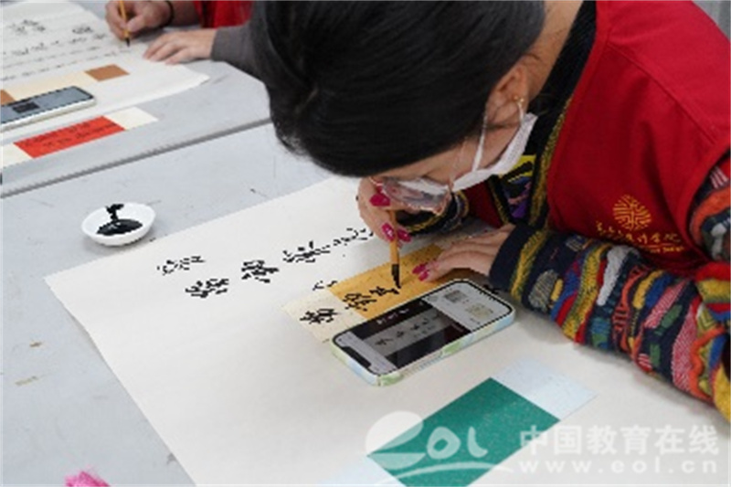 活动前期,同学们汇聚在公司教室里,由扎染的同学做好蓝染纸扇的扇面,接着书法专业的同学在晾干的蓝染纸扇和古风书签上书写“劳动最光荣、致敬……”等字样,再传给擅长绘画的同学泼墨挥毫,以流水线合作的形式创作出精美的墨香作品,一笔一划都包含了同学们对劳动者的感激与敬佩。