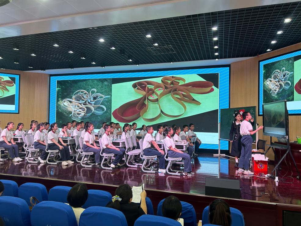 第一节展示课是由温州第二实验中学实习生代表叶佳慧带来的自编课程《水之道》-梨园风骨寄丹青。课堂以水袖舞作为导入,整堂课的氛围充满中华古典韵味,将水袖与国画水墨纹理相结合,将水拓作品与戏曲人物进行联想创作,让大家眼前一亮。