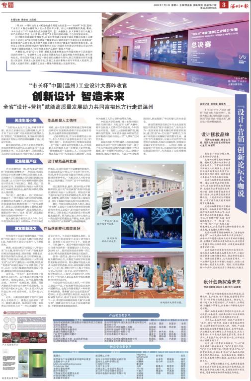 7月3日,一场科技与艺术相融的盛会再度如约而至——“市长杯”中国(温州)工业设计大赛总决赛在市人民大会堂拉开大幕。经过大赛前期激烈角逐,最终,18件作品从7207件参赛作品中突围而出,登上决赛舞台,向大家展示设计的魅力和产品背后的思考,也让更多人看到了文化与科技的相融、个性与智能的共存。经过精彩的路演和答辩环节,由温州市铁路与轨道交通投资集团有限公司建设分公司设计的“温州市域铁路越江隧道复合衬砌结构受力性能自动化监测系统”最终摘得产品奖金奖,来自意大利都灵理工大学的“微藻农”摘得创意奖金奖。温州市工业科学研究院设计的“益智教学小火车”和温州市创意设计有限公司设计的“高速公路辅助机器人”分获创意奖和产品奖的“最佳人气奖”。大赛现场,全省“设计+营销”赋能高质量发展助力共同富裕地方行走进温州活动同步举行。省级特色工业设计示范基地与山区县结对助力共同富裕,举行签约仪式。市经信局与省工业设计协会进行战略合作签约,浙江创意园分别与永嘉县人民政府、苍南县人民政府签约,乐清工业设计基地分别与平阳县人民政府、文成县人民政府签约,诸暨市工业设计基地与泰顺县人民政府签约。关注生活小事作品彰显人文情怀“当时我太太生产之后,护理非常不便。我自己亲身经历过这样的痛点,所以才有了设计这款‘可卧床使用的便携洗头机’的想法。”在路演现场,来自深圳市格物创新设计有限公司的匡硕硕解释了自己的设计初衷。颇有意思的是,这并不是他首次参赛,而每次参赛带来的作品灵感,均来自于身边的细微小事。在上届大赛中,匡硕硕团队关注到自己身边的农村留守老人采摘果子的困难,设计的多功能采果梯通过简单机械结构即可快速转换成梯子形态或拖车形态,作品最终获得创意奖铜奖。记者观察发现,在今年参赛的设计师中,不少人的设计灵感均是来自于自己的“斜杠身份”。自由设计师王智薇本身就是一位“宝妈”,她带来的智能婴儿车,在传统婴儿车的概念上进一步增强了安全性能。多功能安全助手天花板打孔辅助梯 “我爸爸就是一名装修工人”。自由设计师黄志龙设计的“天花板打孔辅助梯”,则是作为装修工人的父亲给他带来启发。中国美术公司教授、博士生导师郑巨欣在点评时表示,在每届“市长杯”大赛中,都不乏有极具人文情怀的作品出现,今年的作品亦如是。而更让人感到惊喜的是,随着科技的发展,今年更多设计师开始关注到平衡高科技和传统设计的“人情味”之间的关系。如温州医科大学附属第二医院的吴聪聪团队带来的“水中分娩医疗设备”,通过产生无声震动带动池内水波轻微击打孕妇腹部,进一步缓解孕妇生产压力,降低分娩痛苦,缩短分娩周期。在减少孕妇疼痛的同时,更加保障了孕妇和婴儿的生命安全。类似的案例还有浙江叶丹文化创意有限公司带来的“数字夹缬文化”,该作品作为一款国家级非遗夹缬纹样智能识别系统,通过打造“AI+文化遗产”新模式,为传承千年的温州夹缬赋予新的数字生命。通过扫节气夹缬纹样,可展示对应的节气科普图片或视频;扫城市夹缬纹样,则能展示该城市文化宣传内容……以内容、视频、链接其他平台等形式,在最短时间内把所需信息提供给用户,大大提高了文化传播效率。聚焦鞋服产业设计赋能品牌发展在总决赛的前一晚,作为本届“市长杯”的重要配套赛事之一,中国(温州)国际时尚设计大赛决赛在世纪公园精彩上演。这场融合了江南瓯越之风与国际新潮之光的比赛,让人们从中充分领略温州时尚设计的生命力与创造力。据悉,经过广泛发动和宣传,本届国际时尚设计大赛共收到了1848件报名作品,最终有28件优秀作品入围决赛。华灯初上,夜色撩人。在灯光和音乐的催动下,一件件极富巧思与时尚的时装,在模特的走秀演绎下,将设计师天马行空的创意展现得淋漓尽致——“穿行最西北”,那是从大漠黄沙里撷取了最热血粗犷的时尚元素;“回到拉萨”,那是雪域高原上最圣洁的一抹白;“追本‘塑’源”,那是发自塑料垃圾的环保呼吁……据大赛组委会相关负责人介绍,在今年的国际时尚设计专项赛中,有不少熟悉的面孔,这说明得益于往届赛事的影响力,有越来越多设计师认可“市长杯”的平台。同时,更多的设计新力量也开始加入到这场时尚赛事中来,一大批设计人才和专业作品正选择通过“市长杯”这个平台崭露头角。经过激烈角逐,最终,青岛科技大学郭晓辉团队设计的“桥豆麻袋”获得中国(温州)国际时尚设计大赛金奖。现场还开展了温州时装企业发布的模特走秀,所罗、飘蕾、金鸳鸯、迪哈利等一批温州本土服装企业,进行了服装时尚新品推介和品牌宣传。赛后,市经信局相关负责人表示,通过“市长杯”工业设计大赛各项赛事的持续推进和全市对工业设计、时尚设计宣传的不断投入,目前全社会关注创新设计的氛围越来越浓厚。作为浙江省三大中心城市之一和全国知名的服装生产基地,未来,温州时尚设计的“金字招牌”也将越擦越亮。激发创新活力作品落地转化成效良好作为我市工业设计领域的盛会,“市长杯”中国(温州)工业设计大赛已连续举办6届,为我市的工业设计业态引入了源源活水。据悉,本届大赛以“创新设计,智造未来”为主题,聚焦与我市“5+5”产业体系密切相关的装备