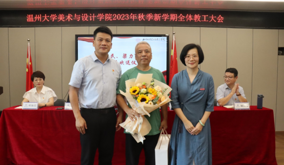 首先,举行了教师荣退欢送仪式。隆重欢送视觉传达系专任教师李利民副教授、美术学专业油画专任教师梁力宏副教授等2位教师光荣退休,并赠送鲜花和纪念品。