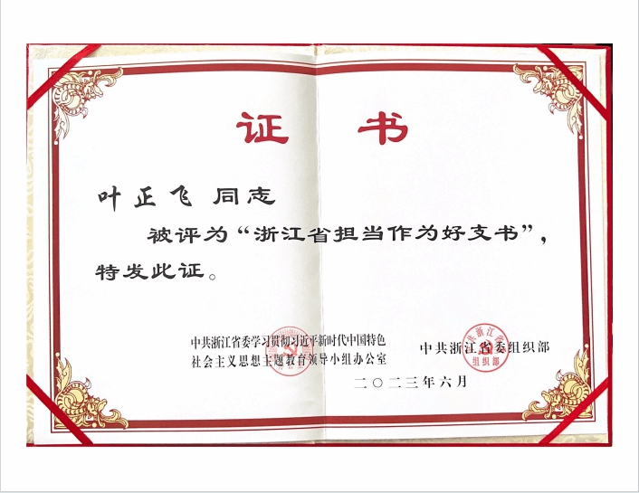 喜报:公司党委书记叶正飞同志荣获“浙江省担当作为好支书”荣誉称号