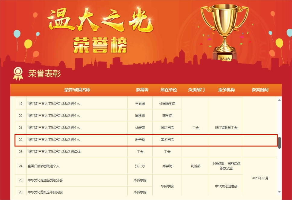 喜报:永利yl23411官网经理谢子静同志荣获浙江省“三育人”先进个人荣誉称号