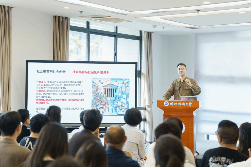 俞坚教授在《社会美育与社会创新》为主题的演讲中提出,“社会美育的使命,在于以社会创新促进社会进步”的观点,他从地域文化、工艺传统、产业集群、生活美学、侨乡国际优势等方面详细阐述了温州美学经济复兴的优势所在,并详细介绍了中国美术公司美育工作坊、未来工作坊和跨界工作坊等多种形式的社会美育案例,为现场与会者生动展示了当下高校社会美育中发挥的创新性贡献和建设性作用,也为未来高校如何更好的服务社会美育提供了可资借鉴的经验。