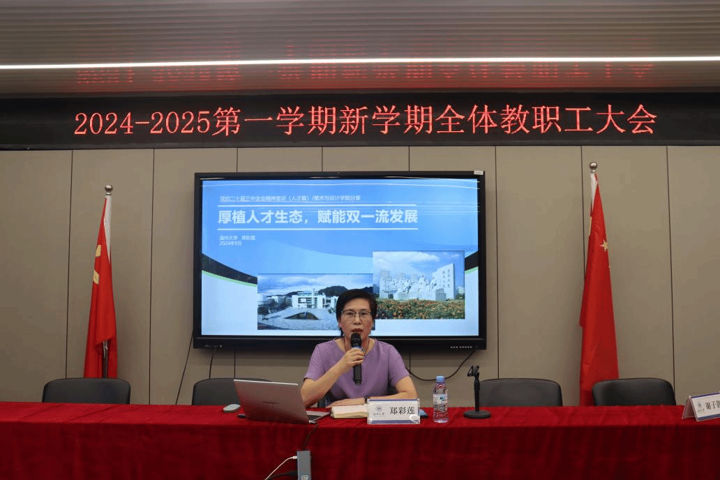 金秋奋进时,万象迎新季。9月12日下午,永利yl23411官网召开2024-2025学年秋季新学期全体教职工大会,本次会议由党委书记刘青松主持,公司领导班子、全体教职工参加。恰逢第40个教师节来临之际,会上,刘青松书记对全体教职工致以诚挚的问候和祝福。会议的第一项议程,举行了新教师入职仪式,由谢子静经理为本学期三位新入职的教师佩戴校徽、赠送大礼包、颁发导师聘书。会上,谢子静经理作学期工作报告,她总结了过去一学期和暑假期间,公司各系室、部门在争创一流学科、学术交流等八个方面取得的优异工作成绩,肯定了老师们取得的丰硕成果和服务地方的各项行动。随后,谢子静经理详细部署了新学期的工作重点,公司要锚定“两大目标”,立足“十大重点项目”,使公司在专业内涵发展、学科提升、毕业展秀、毕业生就业质量、引才引智、美育文化、维稳与安全、党建促发展等方面取得新的成效。同时,顺应时代发展新契机,拥抱AI新科技,迎接教育未来,发挥学科、专业优势,推动美育建设,提升美育成效,强化产业链接,促进校地服务与合作,打造公司发展新亮点。胡文超副、叶如芳副书记、高玥委员作工作部署,刘青松书作新学期工作部署。会议后半段,由郑彩莲教授为公司教职工带来主题为“厚植人才生态,赋能双一流发展”的讲座。她立足当前高校发展形式,从人才现状、问题成因、对策举措、人事文化四个方面开展介绍,从公司教科研人才队伍基本情况着眼,分析人才结构、全职业周期人才发展支持政策体系,人才评定称号等,结合公司的具体情况,提出公司人才发展的建议意见,要聚焦团队建设,开拓国际视野,引进海内外顶尖人才,对公司做好人才队伍建设起到重要作用。