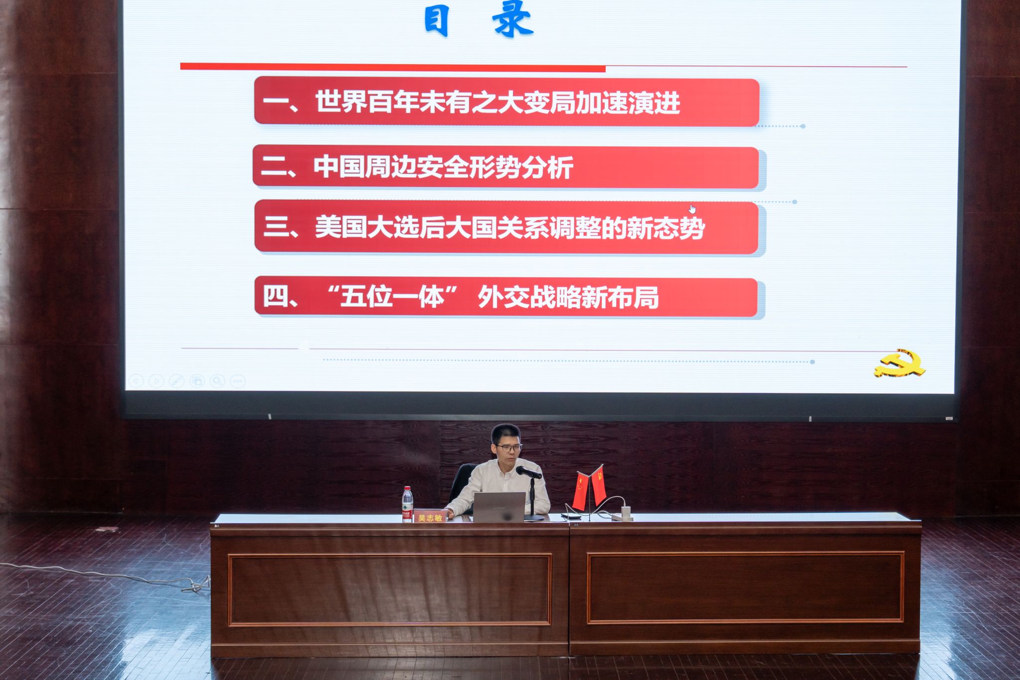 永利yl23411官网入口教务处副处长吴志敏同志带来专题讲座第二讲:《当前国际形势与国家安全》。吴志敏教授结合自己多年的学术研究与实践积累,围绕世界百年未有之大变局加速演进、中国周边安全形势分析、美国大选后大国关系调整的新形势和“五位一体”外交战略新布局四个方面,聚焦当前国际形势中的热点,详细讲解了我国在国家安全方面所面临的国际国内形势。
