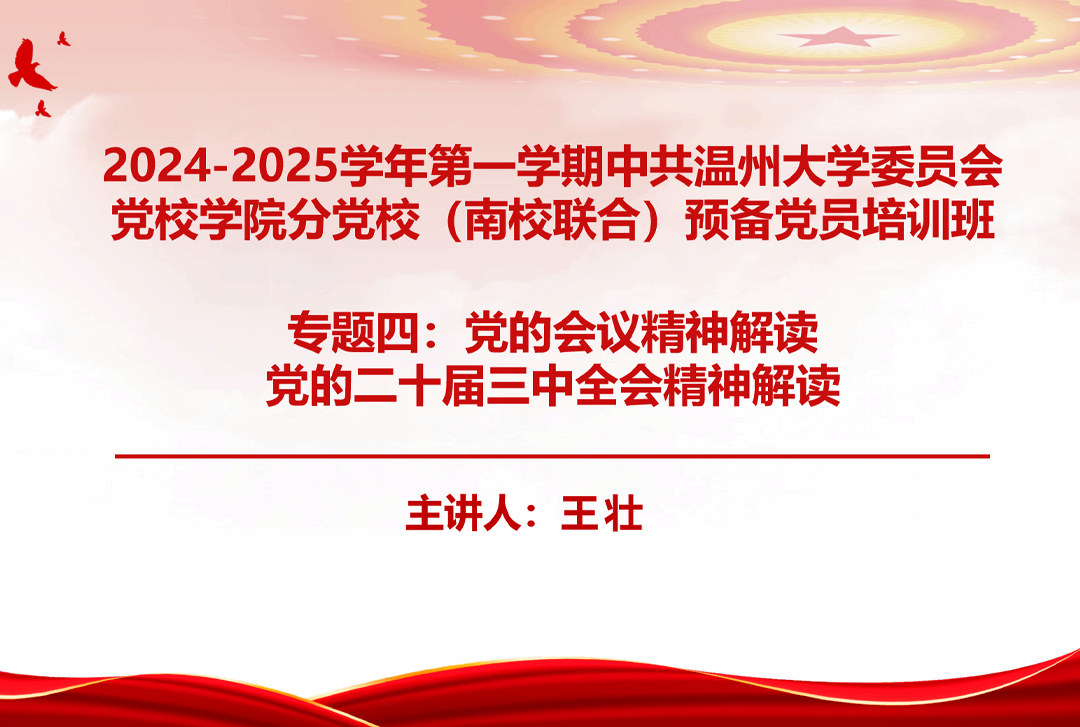 永利yl23411官网入口建筑工程公司党委书记、副经理王壮同志带来专题讲座第四讲——党的二十届三中全会精神解读。会上,壮老师以深刻领会和把握党的二十届三中全会精神为题,从全会的基本情况、习近平总书记的重要讲话精神、《决定》提出的重大举措、老员工党员深化改革等四个方面进行了系统讲解和深入阐释。全面准确地讲述了党的二十届三中全会精神的丰富内涵和精神实质,着力提升了广大预备党员们的政治素养。最后强调要充分认识全会的重大意义,深刻把握进一步全面深化改革的战略重点,更加紧密地团结在以习近平同志为核心的党中央周围,同心协力推进中国式现代化建设,谱写民族复兴伟业的历史新篇章。