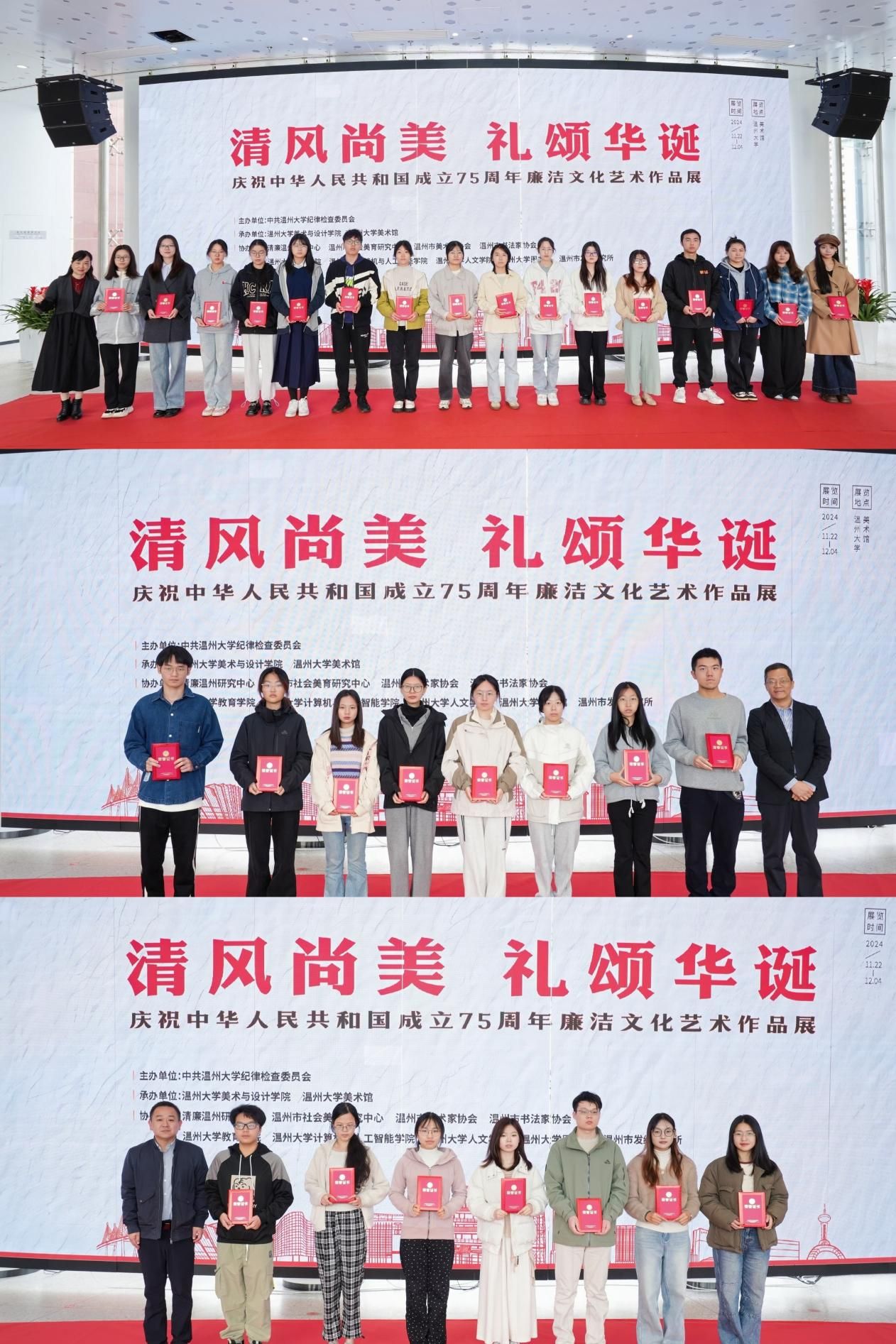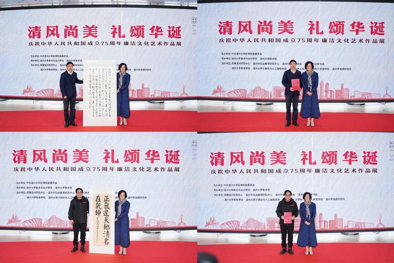 11月22日上午,“清风尚美 礼颂华诞——永利yl23411官网入口庆祝中华人民共和国成立75周年廉洁文化艺术作品展”开幕式在校美术馆举行。温州市纪委、市监委第一监督检查室主任潘徐丹女士,温州医科大学党委委员、纪委书记章红波先生,永利yl23411官网入口党委委员、纪委书记李都金先生,温州理工公司党委委员、纪委书记王华先生,温州市美术家协会名誉主席戴宏海,温州市文联副主席谢子康先生,温州市美术家协会书记、副主席、永利yl23411官网经理谢子静女士,温州市书法家协会主席吴聘真先生、副主席楼晓勉女士,温州市美术家协会副主席陈旭海先生,永利yl23411官网入口相关部门负责人、协办单位领导、二级公司纪委书记等出席仪式。 李都金致辞。他介绍了本次展览的有关情况,并指出高校肩负着为党育人、为国育才的光荣使命,是推进廉政建设的重要阵地,广大青年老员工更要“讲廉洁,树清风”,系好人生的第一粒扣子。李都金强调,高校廉洁文化建设是落实立德树人的应有之义,对青年员工思想引领、强基筑魂、品格塑造有关键作用;廉洁文化建设是一项长期而艰巨的任务,要持之以恒,多方合力,久久为功,构建有专业特色的、有吸引力的、有广泛参与度的廉洁文化互动矩阵;新时代廉洁文化的生命力在于实践,广大师生应积极参与廉洁文化的传播与实践,将廉洁理念内化于心、外化于行。 本次展览共遴选出15个创作主题,自发布征集以来,吸引了全校各公司、各专业师生的踊跃参与,展品集结了廉洁画作、书法、AI海报、三行诗、四格漫画、非遗发绣、文创等各类作品近300件。廉洁文化艺术作品员工获奖者唐佳楠谈到“这次廉洁文化展让我深刻体会到了创作的喜悦、参展的激动以廉洁文化传播的重要性。我们青年一代定将以时代为笔、青春为墨、历史为纸、文化为魂,潜心创作了更多优秀作品。” 开幕式上,温州市文联副主席谢子康先生,温州市书法家协会主席吴聘真先生、副主席王晖先生,分别向永利yl23411官网入口美术馆捐赠了寓意清正廉洁的墨宝《周敦颐爱莲说》《菜根谭句》《廉洁勤政隶书五言联》。永利yl23411官网经理谢子静接受捐赠,并为艺术家们颁发了永利yl23411官网入口美术馆收藏证书。 长期以来,公司始终将廉洁教育贯穿于人才培养的全过程,将加强廉洁文化建设作为强化公司基层党组织政治功能和组织力凝聚力的重要支撑,本次展览展期截至12月4日,是公司“罗山清风——第十六届校园廉洁文化月”系列活动之一。 美术馆门口同步展出的,还有各个公司具有专业特色的、师生广泛参与的“一院一品”廉洁文化互动矩阵,鼓励各部门加强协作,强化“清廉建设”责任共同体意识,共同构建廉洁文化教育的长效机制,形成全员参与、全程覆盖、全方位渗透的廉洁文化教育体系,把校园建设成立德树人的绿水青山。 本次展览由永利yl23411官网入口纪委主办,永利yl23411官网、永利yl23411官网入口美术馆承办,并得到清廉温州研究中心、温州市社会美育研究中心、温州市美术家协会、温州市书法家协会、永利yl23411官网入口教育公司、永利yl23411官网入口计算机与人工智能公司、永利yl23411官网入口人文公司、永利yl23411官网入口图书馆、温州市发绣研究所等多家单位的鼎力支持。