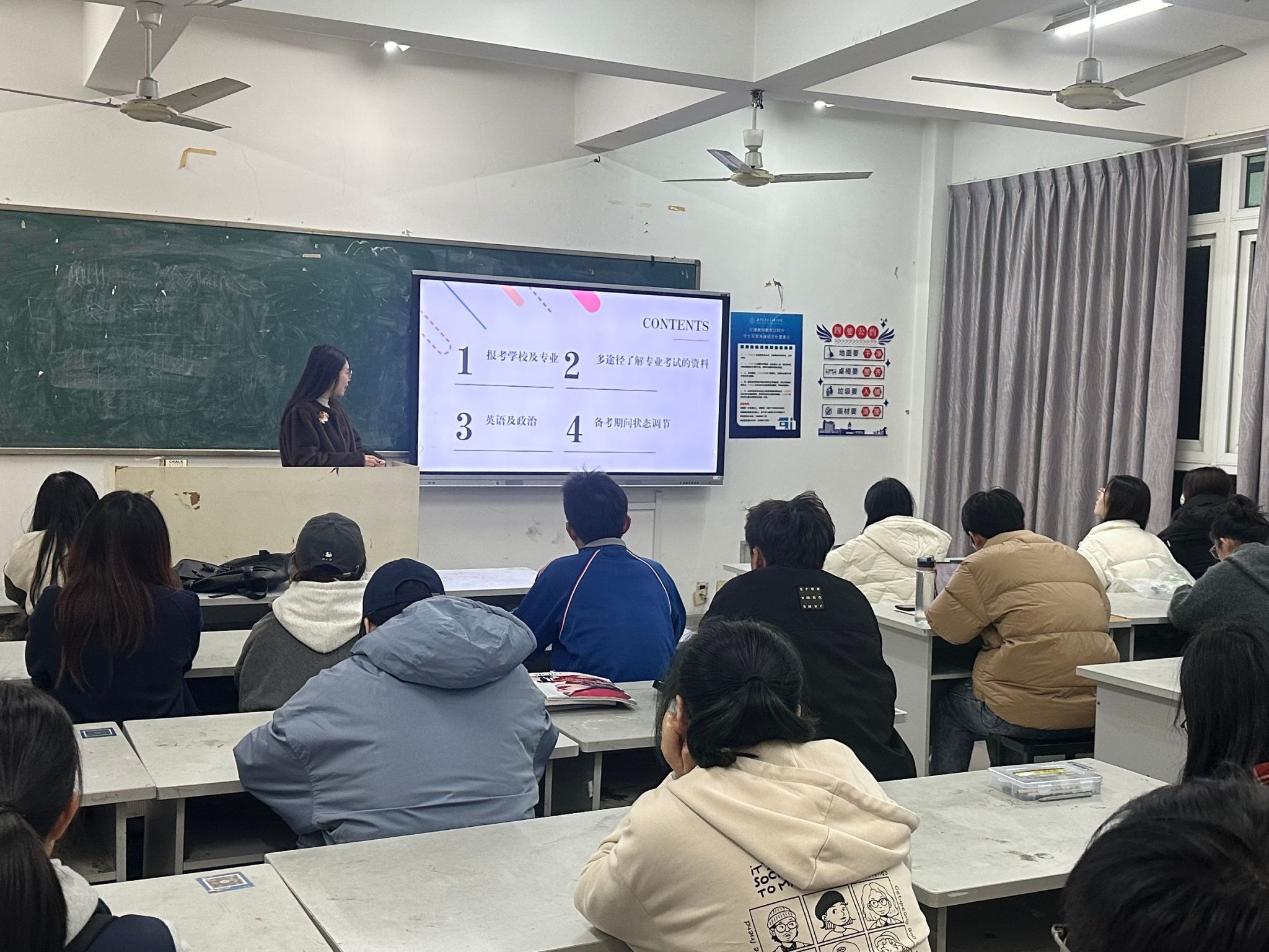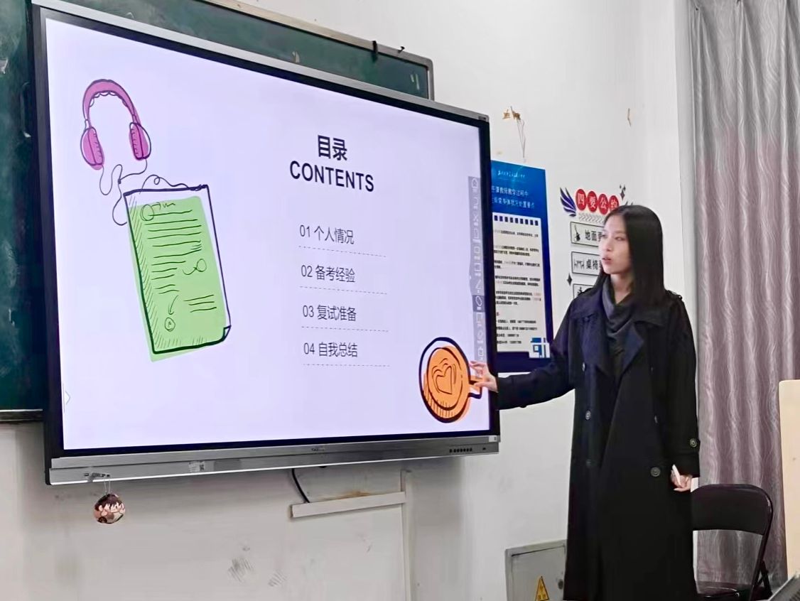 2024年11月24日,24研究生2班的杨晓凤同学进行了考研经验分享。杨晓凤同学提醒大家要综合考虑报考院校的层次和报录比,全面评估自身的学术基础、职业规划和兴趣,确保所选院校和专业既符合个人长远发展目标,又能提供适宜的成长环境。这也使同学们充分认识到考研不仅是一次知识的试炼,更是自我的探索与成长,唯有精准规划、稳扎稳打,方能在考研之路上行稳致远,达到理想目标。