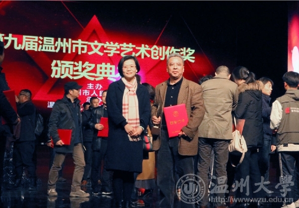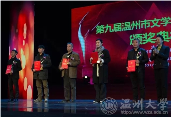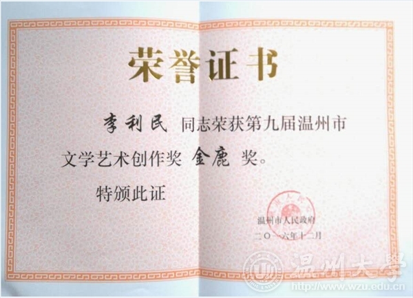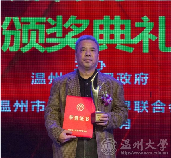 2016年12月29日下午,由温州市人民政府主办,温州市文学艺术界联合会承办的第九届温州市文学艺术创作奖颁奖典礼在温州市工人文化宫成功举办。永利yl23411官网李利民老师荣获金鹿奖,该奖项是温州市政府设立的文艺最高奖,每三年评选一次,温州市委常委、宣传部长胡剑谨,温州市副市长郑朝阳出席颁奖典礼并给金鹿奖获得者颁奖。