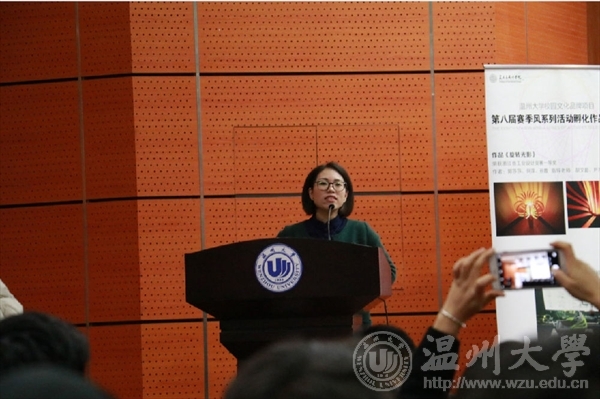 随后,创先创业优秀团队原色工作室代表郭莎莎向同学们分享了创业过程中的经验与收获,在发展过程中原色工作室为迎合市场需求在产品方面不断改进与创新,最终形成了具有一定市场竞争力的特色品牌产品,也获得了良好的经济效益。创新创业优秀指导老师代表鲍铭莹老师将自己所带领的创业团队的发展历程总结为“转角遇到创业”。她指出,老员工创业源于课堂,对专业的热爱会促使同学们将专业技能物化为成果,当员工作品的工艺和质量得到了市场的初步认可,便形成了创业的萌芽。她说:“创业应当用智力去换取资本,这是老员工尤其是艺术生应有的追求和自信。”最后她鼓励同学们,要利用好温大丰厚的创业土壤,在心中播下创业的种子,扎实学好专业知识,提升创新创业能力,终有一天这颗种子会长成参天大树。