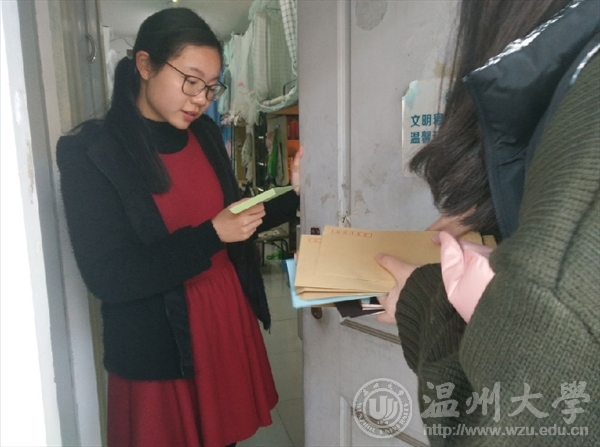 2016年12月28日,永利yl23411官网“艺家人”青年志愿者协会在超豪学区开展了弘扬“雷锋”精神的“爱心邮递”活动。 在数字化信息化的时代,人们似乎已经忘记了在通讯技术落后的年代里如何将情感用文字嵌入信中,并让它飘向远方,表达内心情感。此次活动号召通过以信件的方式写下对他人的祝福或者感谢,由志愿者们送到收件人的手中,正是对从前慢节奏的情感交流很好的体验。活动受到了广大同学们的一致好评,同学们纷纷将想说的话写在信纸上,在收齐信件后,小邮差们穿梭在各栋寝室楼内,他们轻叩房门微笑地送上手里的信件,并与收信人合影留念。 图/文:王伟
