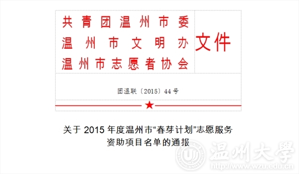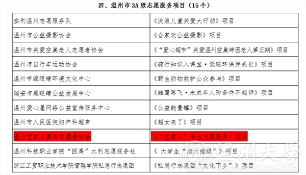 2015年12月12日,在温州市“春芽计划”志愿服务资助项目名单上,永利yl23411官网入口“艺家人”青年志愿者协会荣获永利yl23411官网入口唯一一个3A级项目,即温州市“春芽计划”3A级志愿者服务项目。