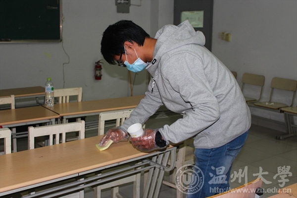2015年12月6日下午,为了提高同学们保护公共环境的意识,公司“艺家人”青年志愿者协会联合校文明督察队在美院教学楼内开展了以“拒绝课桌文化”为主题的清洁课桌桌面的活动。 为确保大家的安全,校文督的陈镜宇同学带来了口罩以及所需要的清洁用品,并且组织大家进行了简单的分组。小分队在各自的队长的带领下,前往各个教室进行“桌面复原”工作。整个活动期间,志愿者们表现的都十分积极。 此次活动不仅是把桌面打扫的干干净净,更重要的是提高同学们保护公共环境的意识,为公司,为自己构建一个美好的学习环境。 文字:王烨 拍摄:王烨