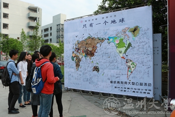 在第41个世界地球日来临之际,在“七十亿人的梦想: 一个地球,珍惜地球资源,转变发展方式,倡导低碳生活”的呼吁下,4月21日,永利yl23411官网“艺家人”青年志愿者协会在美院楼举行了“乐行于艺,环保于己”地球日废纸再利用公益活动。 此次活动,旨在借助地球日活动平台提高公众对地球资源的认识,引导全社会积极参与节约集约利用资源、减少碳排放、促进经济发展方式转变的实践。为此,在今天的活动现场,设置了主题展览,废纸上作画,签名等活动。志愿者们在废弃的报纸,电池,矿泉水瓶等上面作画,一件件精美新奇的艺术作品应运而生,又将作品“画”成也一副巨大的世界地图,别有一番风味,让在场的学子们连连称赞,并纷纷在喷绘上进行环保宣言签名。 地球是人类共同家园,美院学子用自己专业技能变废为宝废,用绚丽的色彩,艺术的行动,倡导公众注意地球状况和人类活动对环境的危害,强调保护和改善人类环境的重要性,此次活动获得全校师生的共同认可和赞扬,并被温州都市报报道。通讯:刘子彰、摄影:孙彦鑫epaper.wendu.cn/Html/2015-04-22/12/content_5.html