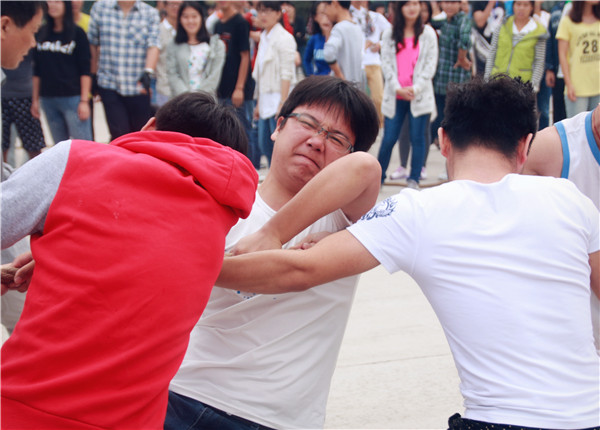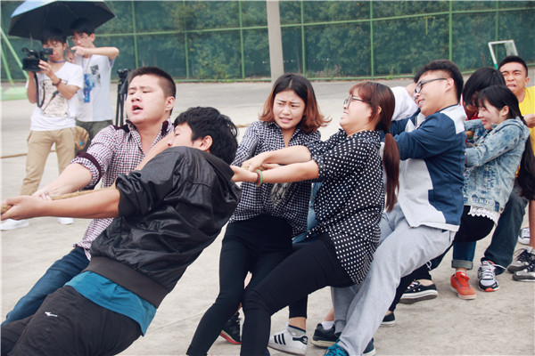 每个人都屏住呼吸,用尽全力投入在拔河活动中。