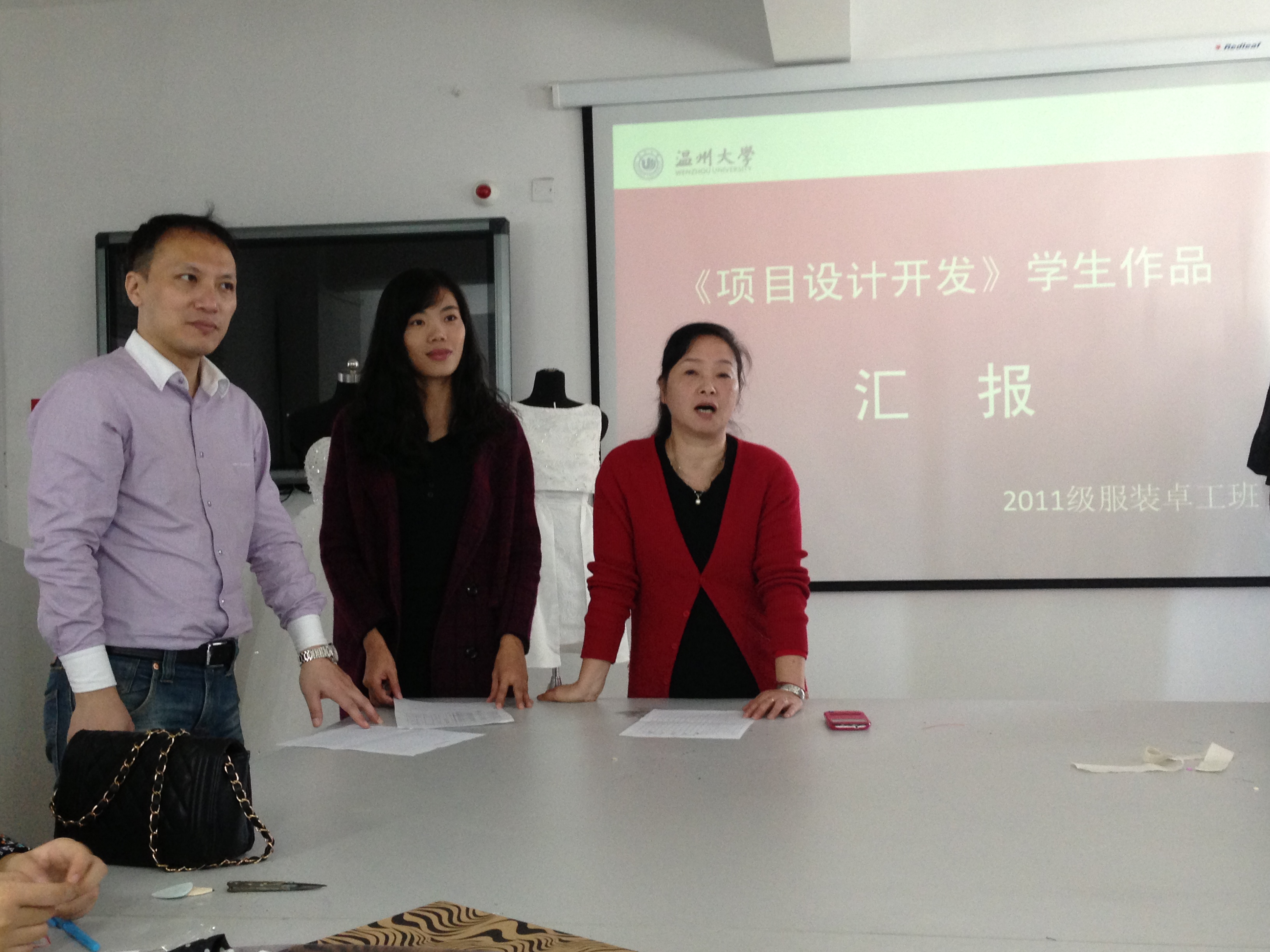 2014年11月28日,2011级服装设计与工程“卓越”班的《项目设计开发》实践课的员工作品汇报会在服装楼2A409教室举行。任课教师陈明艳、陈莹、朱江晖三位老师认真听取了同学们对于作品设计开发的构思理念、款式设计、结构样板设计、工艺制作等环节的阐述,并一一做了点评及评分。 《项目设计开发》是专门为实施卓越计划而量身打造的校内实践课程,其内容综合了服装材料、服装款式设计、服装结构设计、服装工艺、服装工业样板等多项课程的专业知识。通过这些知识的综合运用完成服装系列产品设计开发,使员工掌握设计开发的具体环节与要求,理解服装设计开发实施的流程。在此基础上,培养员工的市场意识、工程意识、创新思维以及综合实践能力,具备独立完成系列产品开发的构思、设计、打板、工艺等综合实践能力,为提前适应企业工作状态打下良好的基础。因此,综合性、实战性、创新性是这门课程的主要特点,对于衔接校内学习与校外实践具有承上启下的重要作用。 该课程在教学方法上采用项目式教学,以项目设计为导向,核心课程为基础,通过主题设计、样板制作、产品加工等流程的有机衔接,最终完成完整的实践项目。它最大的特点是在项目的策划、设计、实施的整个过程中,充分调动员工的主观能动性、创造性,提高员工发现问题、分析问题与解决问题的综合能力。 在传统服装设计与工程专业的校内实践教学的基础上,本实践课引入了项目综合实践模式,为更好地实施卓越计划、形成以项目实践为途径的实践教学模式做了有益的探索与尝试。