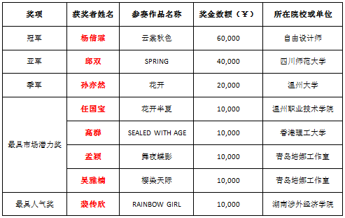 经过紧张激烈的竞逐,世界彩虹•首届卓多姿时尚女装设计大赛总决赛的结果终于诞生!来自湖南涉外经济公司的16号选手裴传欣力压群芳,获得奖金为一万元人民币的“最佳人气奖”。来自浙江温州职业技术公司的04号选手任国宝、来自香港理工大学的06号选手高群、来自山东青岛培娜工作室的09号选手孟颖和011号选手吴雅楠获得奖金各为一万元的“最具市场潜力奖”。季军则被来自永利yl23411官网入口的05号选手孙亦然摘得,奖金两万元。亚军归属来自四川师范大学服装公司的03号选手邱双,奖金四万元。最后,刘亦菲再度登台,与中山市卓多姿服饰有限公司总经理、艺术总监吴肖玲女士一同揭晓冠军得主并颁奖:来自广西的自由设计师、01号选手杨倩霏摘得桂冠,捧走六万元的奖金!