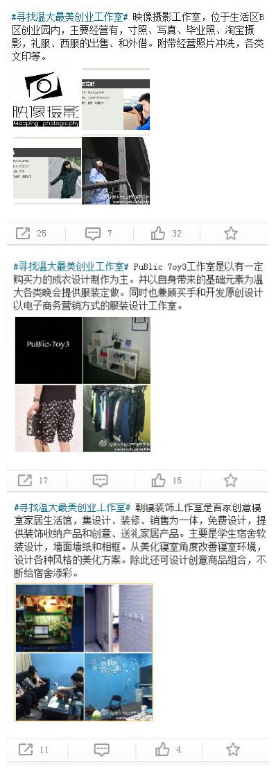 创业实践部人员通过海报、微信、微博等多元化平台,面向全校员工进行了宣传。截至5月20日,共有五家工作室参与评选,分别是:风向文创设计室,它是一家专业设计工作室,主要领域是产品设计,平面设计,设计制作等;映像摄影工作室,它主要经营寸照、写真、毕业照、淘宝摄影,礼服、西服的出售和外借,附带经营照片冲洗,各类文印; PuBlic 7oy3工作室,它是一家以成衣设计制作为主的服装工作室,为公司各类晚会提供服装定做,兼顾买手和以电子商务营销方式的原创设计;朝寝装饰工作室,它是公司首家创意寝室家居生活馆,集设计、装修、销售为一体,免费设计,提供寝室装饰收纳产品和创意、送礼家居产品等; MSSLU工作室,它主要领域是潮态生活,创意设计,活动策划等。比赛通过微博点赞和转发的方式,综合评委意见,最终选出人气奖、专业奖和效益奖。