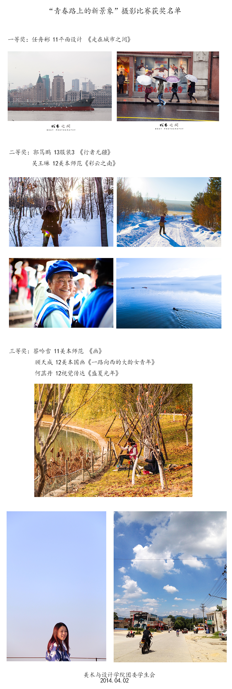 3月 3日—3月18 日,永利yl23411官网团委员工会素质拓展部开展了主题为“青春路上的新景象”的摄影比赛,本次活动特邀了公司员工科辅导员陈赛慧老师担任评委。 活动得到了许多同学的积极参与,同时也征集到了很多优秀作品。拍摄的画面有穿梭于城市街角的忙碌身影;有大东北冬日的雪地风光;有用画笔描绘温大的美丽校园;更有一路向西的大龄女青......同学们用镜头捕捉下了生活中的美好瞬间,留住了点滴的温暖和幸福,让稍纵即逝的感动成为永恒! 摄影,是记录,也是创造。透过镜头,瞬间的精彩被永远封存,它是一门让广老员工既陌生又好奇的艺术,它能形象地记录发生在我们身边的点点滴滴。此次活动为在校老员工提供了一个展示自我摄影技能的平台,丰富了同学们的课余生活。青春路上并不缺少美,只等你去发现! 附:“青春路上的新景象”摄影比赛评选结果: 一等奖:11平面设计 任舟彬《走在城市之间》 二等奖:13服设4班 郭笃鹏《行者无疆》 12美本师范 吴王琳《彩云之南》 三等奖:11美本师范 蔡吟雪《画》 12美本国画 顾天成《一路向西的大龄女青年》 12视觉传达 何菡丹《盛夏光年》
