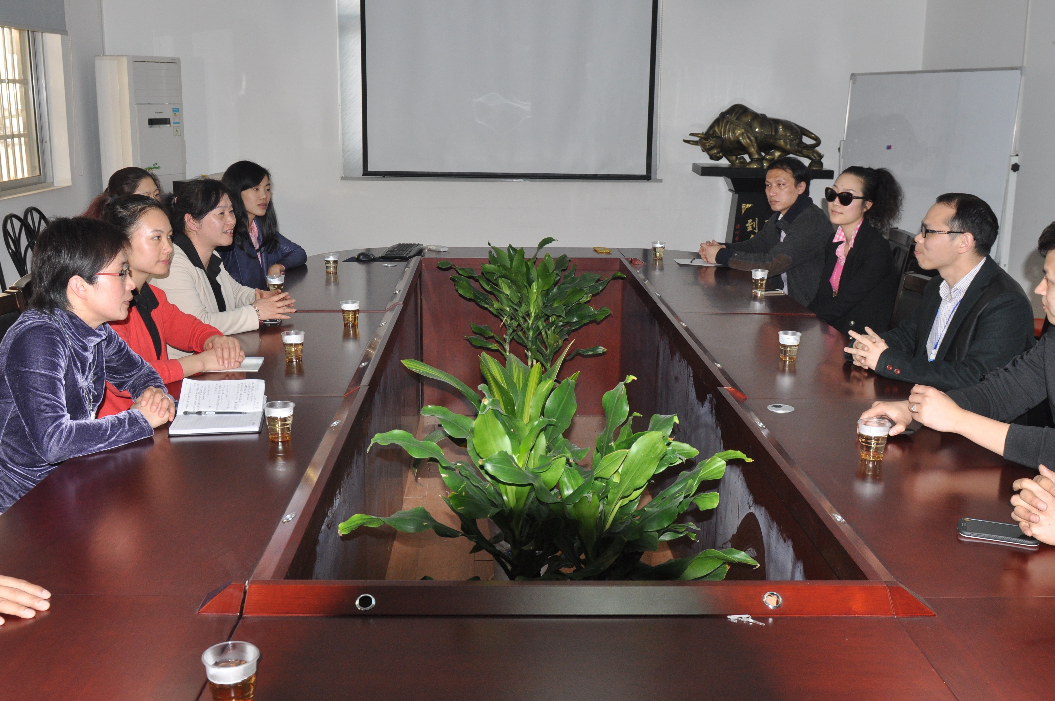 参观后,郑书记、陈主任及各位老师与公司董事长叶剑勇、总经理金上尧以及人力资源部、营销部、设计研发部的负责人进行了座谈交流。会上,人力资源部负责人分别就公司的发展历程、品牌文化、产品定位及管理模式做了详细介绍,与会人员还就具体合作项目的内容、方式等方面进行了广泛深入的交流,会场气氛热情、轻松、愉快。