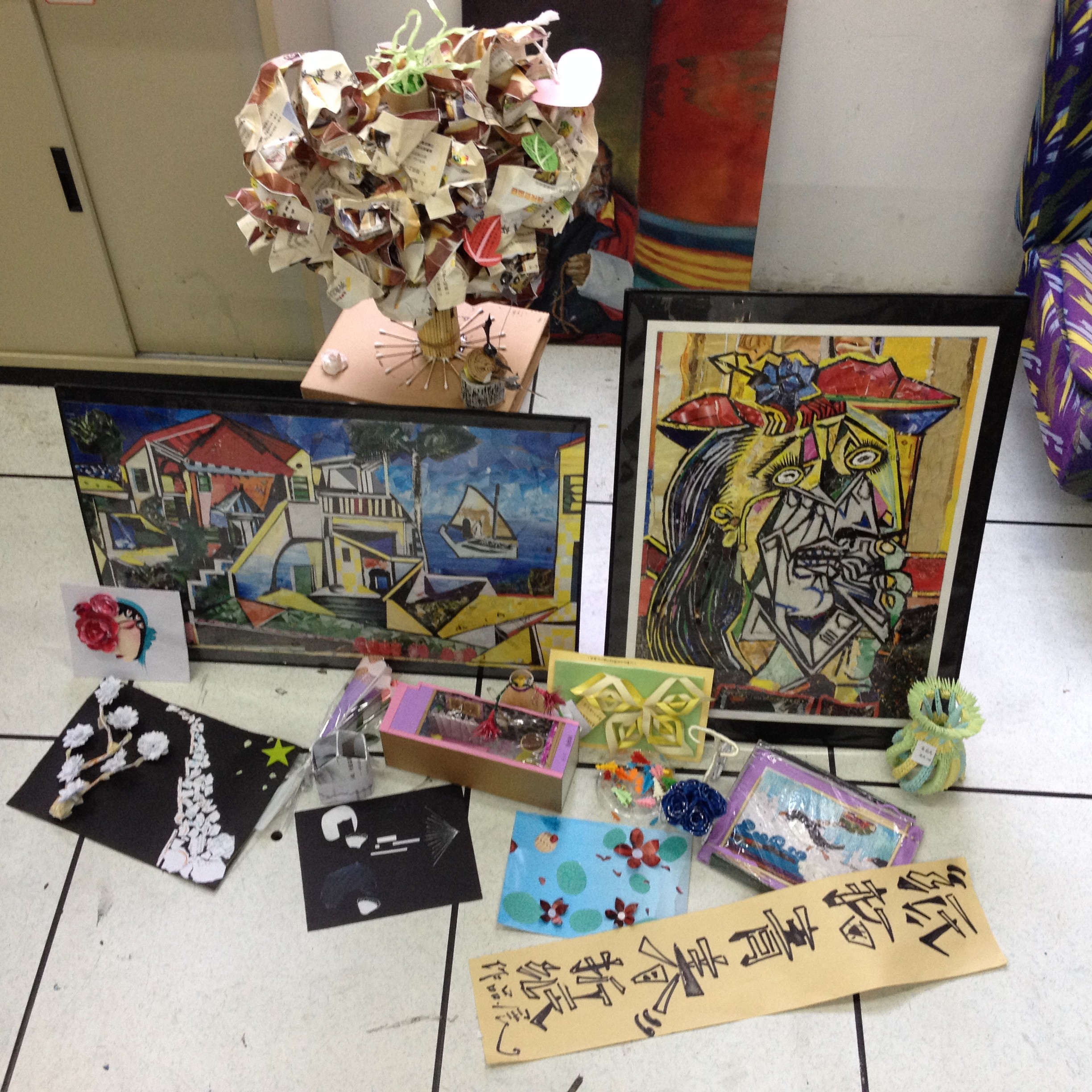 活动征集到了很多作品,其中有用已过期的报纸杂志拼成带有“毕加索”油画风格的抽象人物画和风景画;有用废纸制作成拼叠的瓶子手工艺品;有用废卡纸制成的温馨可爱的卧室小窝;有用废纸制作成精美的鲜花......同学们发挥着各自独特的创意和设计实践能力,将收集到的废纸物变废为宝,制作成精美的手工艺品。既锻炼了自己的动手能力,又丰富了课余生活。