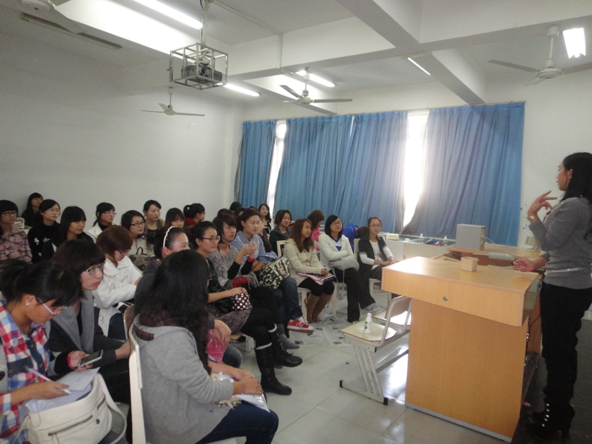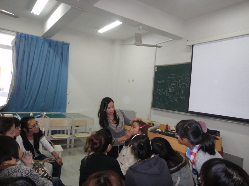 2010年11月20日星期六14:00~16:00,在美院2B3001,雪思美容院经理、医公司WinGirl俱乐部指导老师朱来顺,为公司的化妆培训素质拓展班画上一个完美的句号。 此次培训是朱老师在本学期第四次给大家辅导。其热烈的掌声,阐释着大家对本次培训的渴求和对朱来顺老师的喜爱。朱老师说,化妆是艺术。她要求人们在化妆之前先了解自己今天穿了怎样的服装,代表着怎样的形象以及自己的性格;希望每个人能了解自己面部的优点和缺点各是什么。然后,她让同学来当模特,一步一步地教同学们怎么样打底、修眉、调肤色、画眼线、眼影、腮红和唇彩。而同学们也是热情高涨,积极提问,踊跃参与其中。在示范的过程中,她也再三强调该注意的地方。比如定妆时要用散粉,补妆时要用粉饼,刷子半年洗一次,而在平时,只要用散粉洗就可以了……示范结束后,她则让同学们自己亲手实践。 这次培训,不仅让爱美的女生体验到了化妆带给她们在外表上的飞跃,更是让她们学习到了化妆的真正技巧。