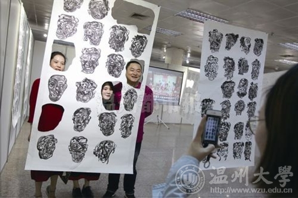 昨天上午,永利yl23411官网2017届毕业作品展在温州市展览馆开幕,参观者与美术作品合影。