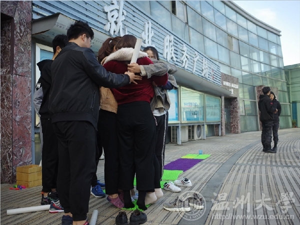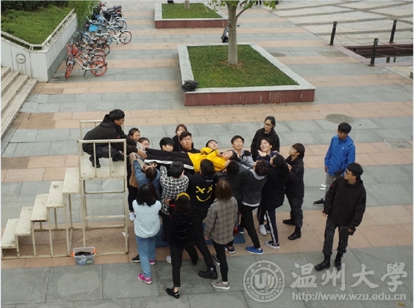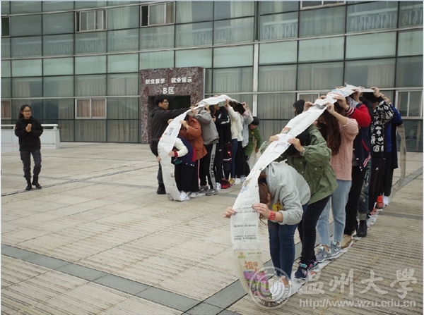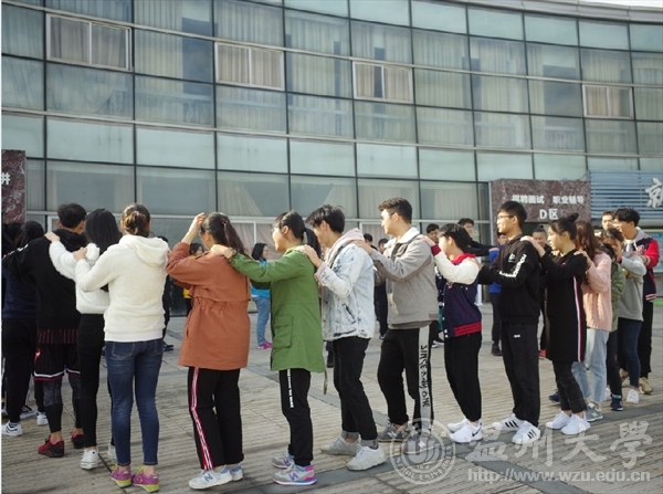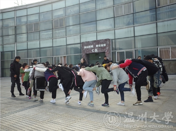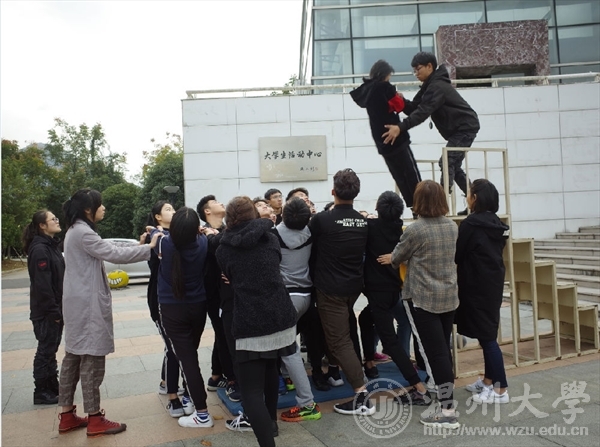 团干第一次户外培训活动在周日下午如火如荼的展开。突如其来的冷空气也阻挡不了同学们的热情。同学们在老员工活动中心依次排好等待培训的开始。一个成功的队伍必须拥有炫酷的队名响亮的口号和统一的队歌。同学们在短短十分钟内发挥想象在大卡纸上刷刷画下了队名和图案,并在完成后在各个队伍前展示。第一个项目是兔子舞同学们整齐的排成一个圈,接受重重挑战。这个项目不仅挑战了同学们的协调性也考验了大家的反应能力。在活动中反应不够灵敏的同学接受惩罚时也引起了同学的爆笑。从第二个项目开始,同学们分为两组分别进行活动。其中一二队同学进行的项目是挑战五分钟。同学们一个接一个用手中的管子运输小球,通过指压板,将小球投进篮中胜利。接下来一连串的项目都是靠大家齐心协力才能完成,默契最佳的组才能获胜。三四组同学的项目是贪吃蛇,两队除了蛇尾外的同学都带上了眼罩,在黑暗中,位于蛇头的同学在地上摸索着散落的木块,项目的关键就在于蛇尾同学的指挥和蛇身同学们的传达,一个协调的整体才能取得成功。接下来一二两组的项目是信任背摔。同学站在一米以上的站台上克服内心的恐惧,往后笔直一摔让背后搭成人桥的同学接住他才算成功。这一项目考验了同学们间的信任度与勇气。三四两组进行的是团队运输,将报纸做成履带同学们作为轮胎在起点与终点间运输气球,同学们默契配合,才能在短时间运输完成。最后一个项目是一方有难八方支援,同学们发挥出无私奉献的精神,应要求纷纷奉献出自己的衣服、鞋子、袜子、甚至是自己。在热火朝天的氛围中,培训画下了完美的句号。在此次培训中,团干们在互动中增进了情感,在比赛中培养了团队协作精神与默契度。相信团干培训活动会越来越顺利。