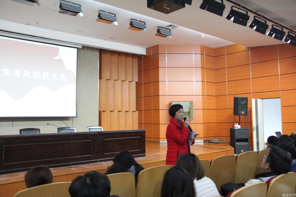 张丽萍书记在动员讲话中重申了考风考纪的重要性和作弊的危害性,她强调学习在于平时的点滴积累,来不得弄虚作假,作弊不能弥补学习上的漏洞,而是一种自欺人人的行为。张丽萍书记还鼓励同学们认真备考,争取考出好成绩。她强调:“大学里的每一次考试都是接受考核认证自我的途径,加强考风建设营造公平的考试氛围,既是每个同学的愿望也是每个同学应该肩负的责任。所以希望同学们在这次考试中能诚信做人,亮出真实的成绩,展现真实的自己。”杨振海副书记根据员工手册相关条例告诫同学们一定不能碰这个底线,在考试过程中不仅仅要交出反映专业知识水平的考卷,更重要的是在考试中要交出诚信的品行之卷。