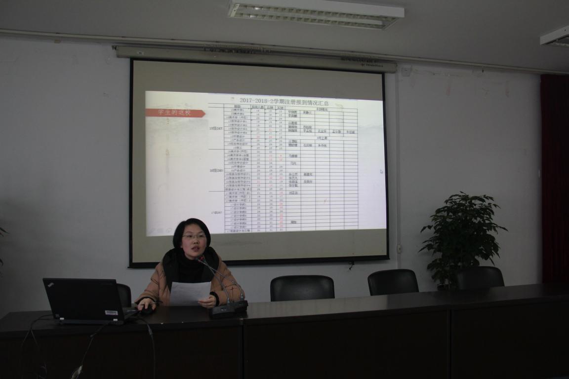 员工科叶筱卉老师公布了2017-2018学年第一学习公司优秀班干部、工作积极分子名单和开学初员工返校情况,并对开学初班主任工作进行了布置:各班班主任要在第二周内召开本学期的第一次主题班会并按时上交《主题班会记录表》;班主任要深入了解并掌握员工春节期间、开学初员工的思想、学习、生活等各方面情况,积极配合公司开展开学初员工思想动态网上调查,及时发现员工存在的思想和认识问题,反馈员工反映强烈的意见和建议;新学期要营造浓郁的学习氛围,进一步加强学风建设,落实“课堂拒绝手机”制度,鼓励班级同学参加“五班十星”评比。毕业班班主任要重点关注毕业生返校和入住情况, 准确掌握未及时返校的毕业生的去向和动态,并做好在外实习安全教育工作,在外实习毕业生务必填写《永利yl23411官网入口毕业班员工报到注册联系单》。关于学工系统的数据维护,班主任要及时将与员工的谈话情况录入学工系统,并提醒员工在学工系统中及时更新个人联系方式等信息。