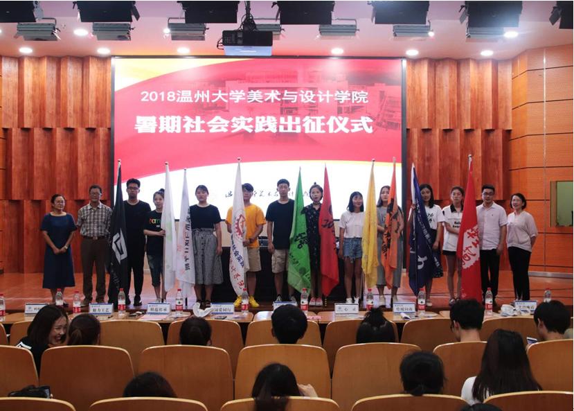 2018年7月4日下午,由美院团委员工会学术实践部举办的2018年暑期社会实践出征仪式在雁山厅隆重举行。出席此次会议的有永利yl23411官网入口公司党总支副书记杨振海老师,蚂蚁行动实践队指导老师许丽慧老师,艺韵晚霞实践队指导老师胡文超老师,绘暖向南实践队指导老师叶筱卉老师。 大会首先由永利yl23411官网实践负责人付秋圆同学介绍2018年实践队基本情况和实践注意事项。2018年永利yl23411官网共十支实践队,三支校级品牌提升项目,三支重点团队和四支一般团队,其中八支队伍都是美院传承了多年的队伍,当然今年也有两支全新的实践队。接下来是蚂蚁行动实践队代表发言,蚂蚁行动是成立于2014年,他们从温州前往云南迪庆藏族自治州进行支教,期间曾为当地村民解决了农产品滞销问题,进行了科普宣传和义诊,还建立了蚂蚁行动图书馆,蚂蚁行动今年也将带着这份责任,再次前往美丽的彩云之南,开始2018年暑期社会实践活动。大会第三项议程,永利yl23411官网公司党总支副书记杨振海书记讲话,杨书记提到实践队外出实践团队意识.形象意识等方面的重要性,同时也对各个实践团队寄予了期望。接下来是全体宣誓,由2018年暑期社会实践员工代表李树鹏同学领誓,全体同学宣誓。 最后杨书记为参加本次社会实践的10支队伍授旗,并集体合影留念。