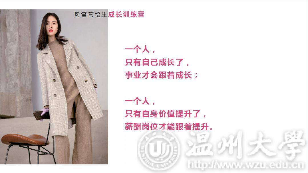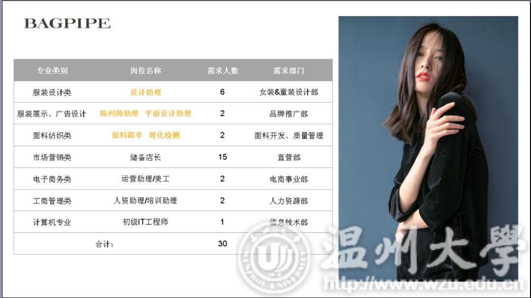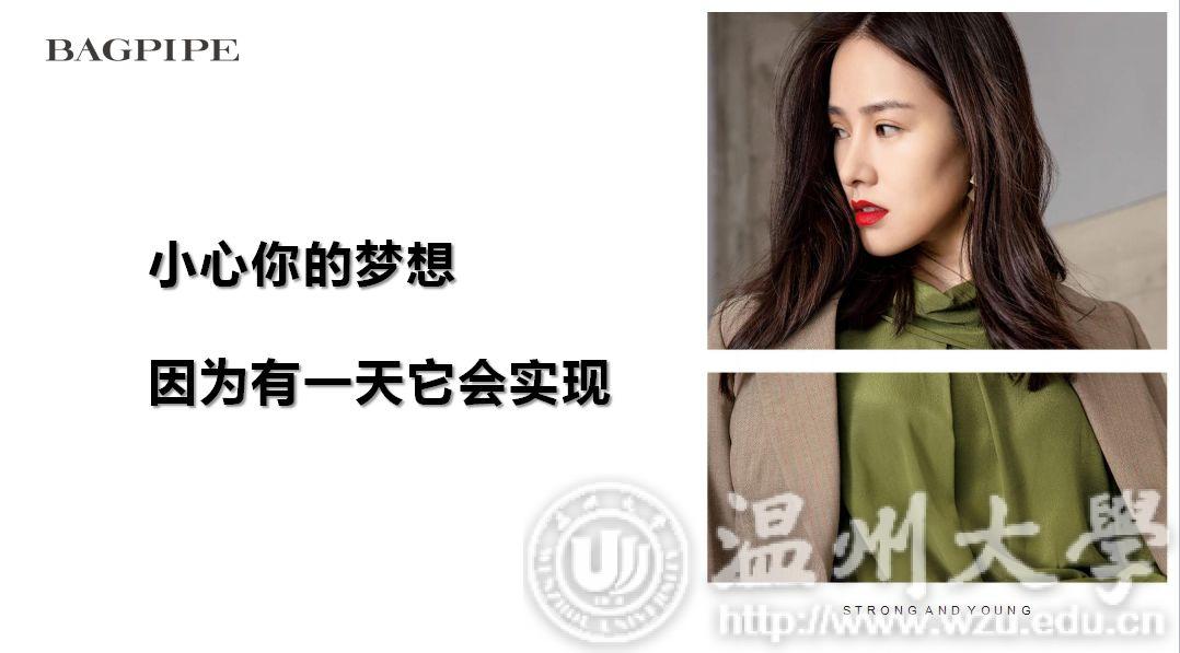 10日19日上午,Bagpipe风笛2019无限想象全国高校巡回宣讲会在美院顺利展开。在多年的合作与交流当中,风笛与温大也结下了不解的情缘。本次宣讲会有公司党总支副书记杨振海与风笛服饰有限公司经理吴朝晓莅临宣讲会现场。 首先是杨书记致开场词,在同学们热烈的掌声中,杨书记侃侃而谈。“温州风笛服饰有限公司与温大美院搭建了一个非常典型的校企合作平台,风笛公司作为公司省级校外实践教育中心,与公司在专业教学、实习实训、就业创业等领域开展全面战略合作,我们非常高兴看到风笛公司一直以来欣欣向荣的发展态势,也希望双方能携手结出更多合作成果。” “不忘初心,使命必达。”风笛宣讲人缪老师在分享风笛创始人创业史、发展史,讲述风笛的过去、现在与未来,同学们都听的津津有味。宣讲会在主持人和同学们的互动中开始后,主持人分别从公司品牌设计风格,员工的衣食住行娱,薪资问题和管培生培养计划等几个同学们关心的方面来介绍风笛服饰有限公司的细节。BAGPIPE风笛成立于1999年,是一家自主开发、生产、销售时尚女装和童装的品牌经营企业。风笛公司的女装品牌分为周末时尚,摩登帅气,精致优雅三个风格,而风笛公司的童装品牌的定位则是针对2-8周岁的儿童设计的,风格多样是风笛公司的优势所在。衣食住行方面,风笛公司也非常重视员工的感受,为他们提供了舒适的环境以便于员工们更好的工作和生活。同时,风笛公司也十分重视对人才的培养,也有一套完整的体系进行人才的引入。这便是风笛管培生培养计划的由来。对于进入风笛上班的应届生,风笛建立了完善的“管培生培养计划”,全面打造“一专多能”的复合型人才,让每个进入风笛的应届生迅速成长,成为独当一面的技术或管理人才。在经过由系统培训、店铺见习、核心轮岗和专岗实践四个环节的管培生培养计划之后,实习生便能更好地融入公司这个大集体。说到薪资方面的话题,风笛公司的PPT上有着这样一段话:“一个人,只有自己成长了,事业才会跟着成长。一个人,只有自身价值提升了,薪资岗位才能跟着提升。”从这段话中我们也可以清晰地看到风笛公司对人才和员工能力的重视。对于服装设计、服装展示、广告设计、面料纺织类的专业,风笛公司也提供了如设计助理、陈列师助理、平面设计助理、面料跟单、理化检测的专业让同学们选择,以便给予同学们更大的就业空间。 “风笛未来,无限可期。”这是这场宣讲会的结束语。无限可期的不仅是风笛的未来,也同样是我们美院同学们明媚的未来。正如主持人所说,人生不设限,未来就会精彩无限。我们也相信同学们在一番拼搏之后,会绽放出人生绚丽的芳华。