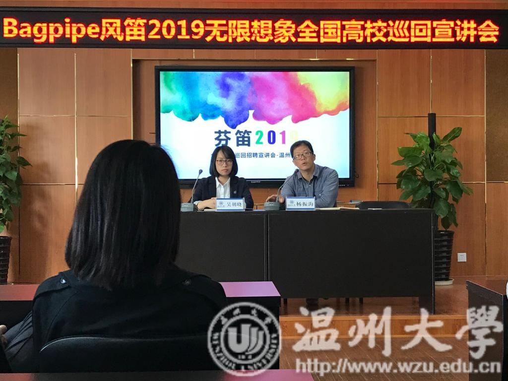10日19日上午,Bagpipe风笛2019无限想象全国高校巡回宣讲会在美院顺利展开。在多年的合作与交流当中,风笛与温大也结下了不解的情缘。本次宣讲会有公司党总支副书记杨振海与风笛服饰有限公司经理吴朝晓莅临宣讲会现场。