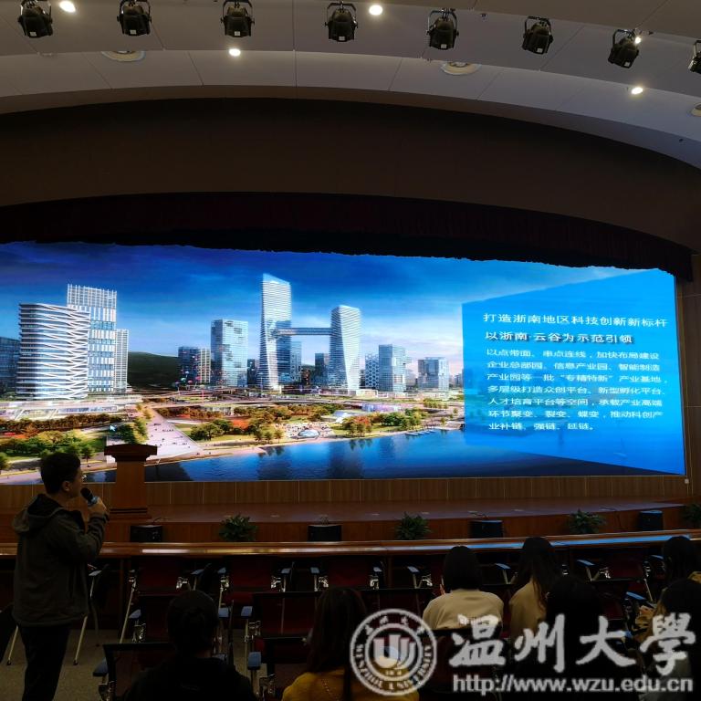 最后,讲解员带领大家来到了路演大厅,在这里,同学们通过视频与PPT的展示了解到了科技城的地域条件,区位要素,建设基础,发展前景等等,为同学们之前的所有的疑惑作了最后的解答。