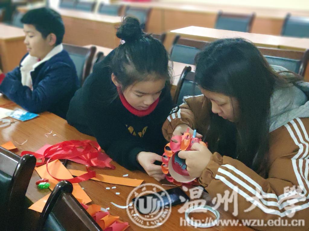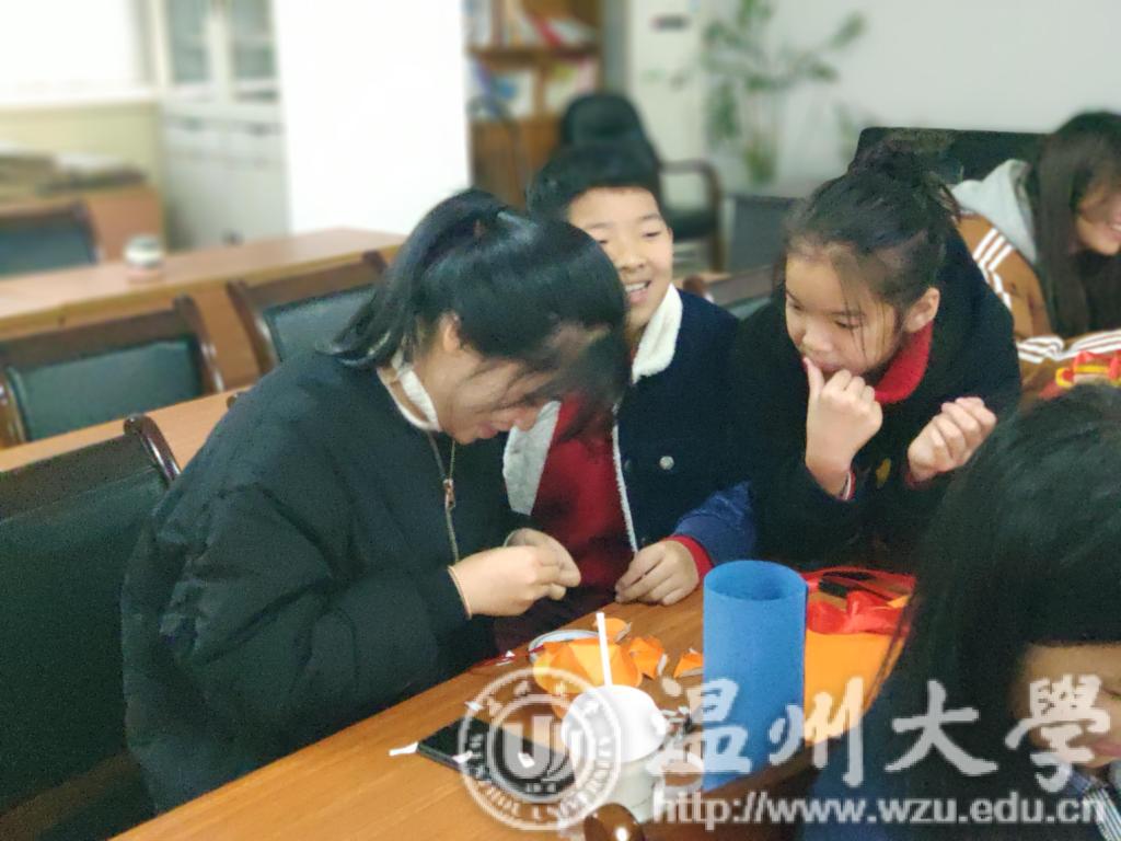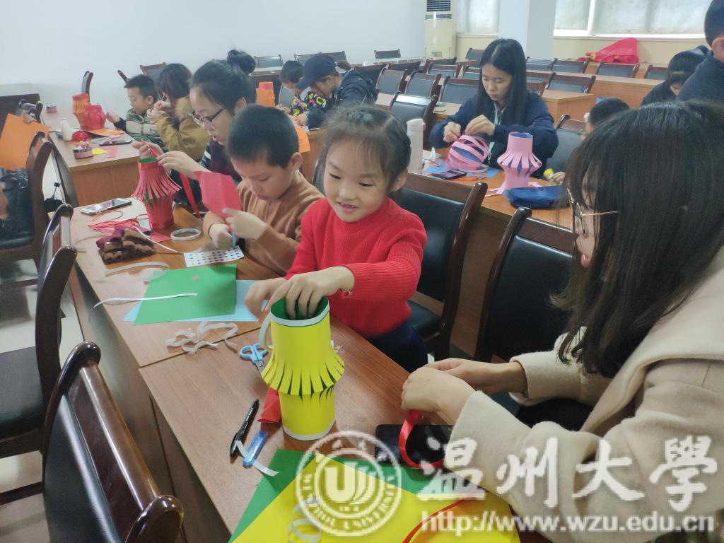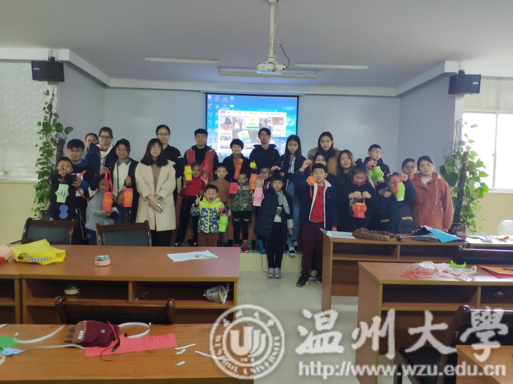 12月9日,温大美院“艺家人”青年志愿者协会带领志愿者们再次来到了睦州垟社区村委会,近日温州大幅度降温,临行前志愿者们都在担心小朋友们能否到来,会不会被温暖的“被窝”打败 。当志愿者们忧心忡忡的来到支教地点,却发现早已有小朋友们在等候着了,激起了志愿者们的干劲,度过了充实而又别开生面的一课! 冷空气没能阻挡小朋友们和志愿者的相遇,经过几次课程的磨合,小朋友们和志愿者早已建立了深厚的感情。每个小朋友来到教室的第一件事就是踮起脚寻找早已搭档好的志愿者老师,我们的志愿者也是给了大大的熊抱表示想念。我们今天的课程是制作小灯笼,讲课的志愿者老师生动的课堂让小朋友们目不转睛。首先课堂的开始是一段精彩的视频,之后向小朋友们提出问题,小朋友们表现积极,绘声绘色的表达着他们的想法。当然回答的小朋友们都有小奖品鼓励。随后志愿者们分发了制作小灯笼所需要的素材。在制作过程中,小朋友们一会精心专注于自己的作品,一会儿又看看边上同学们的作品,就在这样的欢声笑语中,一个个精美的小灯笼就制作出来了。虽然在编织中国结的环节略有难度,但是小朋友们和志愿者们互相协助还是完成了中国结的制作。最后在社区工作者和志愿者们的共同评比下选出了六份小灯笼,并颁发了我们准备的小奖品。 通过这次活动,不仅可以锻炼小朋友们的耐心,培养他们的观察能力和创造能力,在给他们带去丰富的知识和提高他们的动手能力,也可以帮助他们更好的认识自己的缺点。欢乐的时光总是那么的短暂,友谊没有年龄的界限,依依不舍中让我们更加期待下次再见!