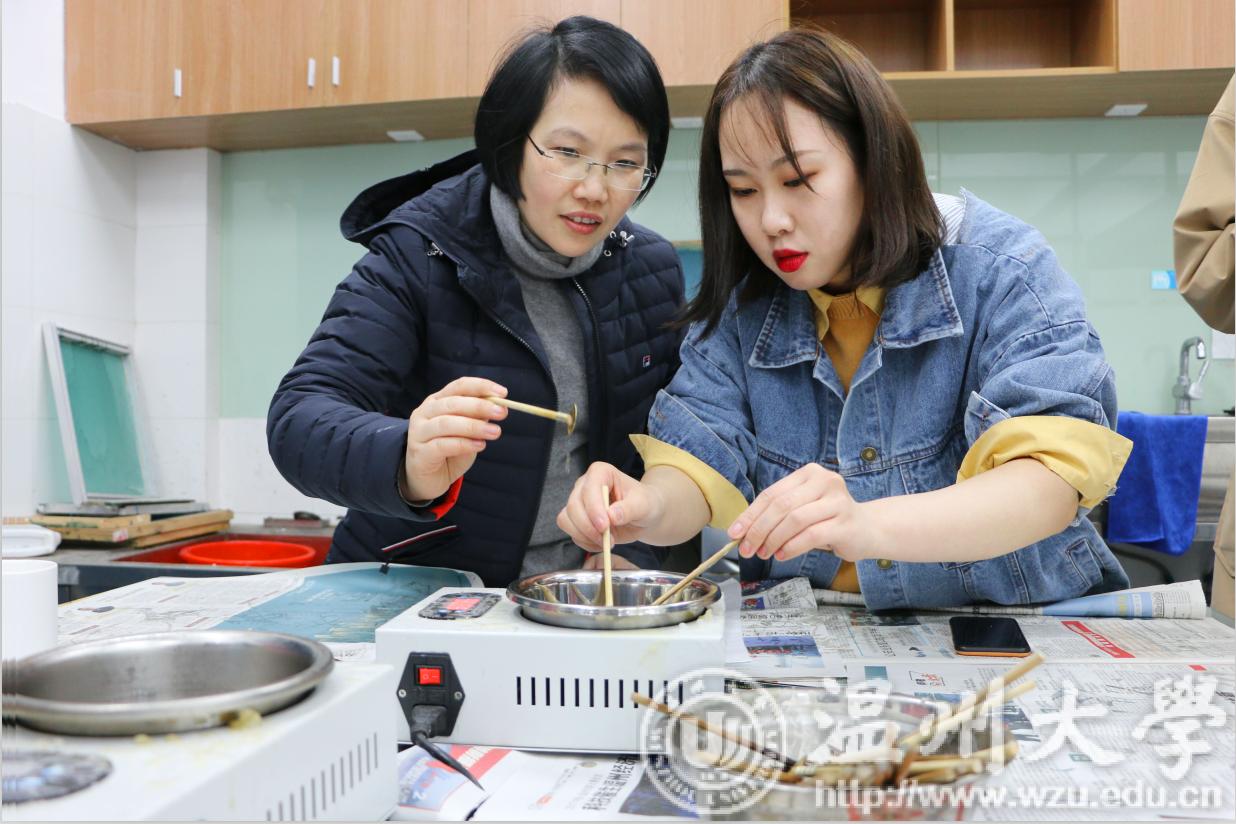 3月6日,为传承中华优秀传统文化,迎接“女神节”,美院团学在服装楼201印染室开展了蜡染体验活动。