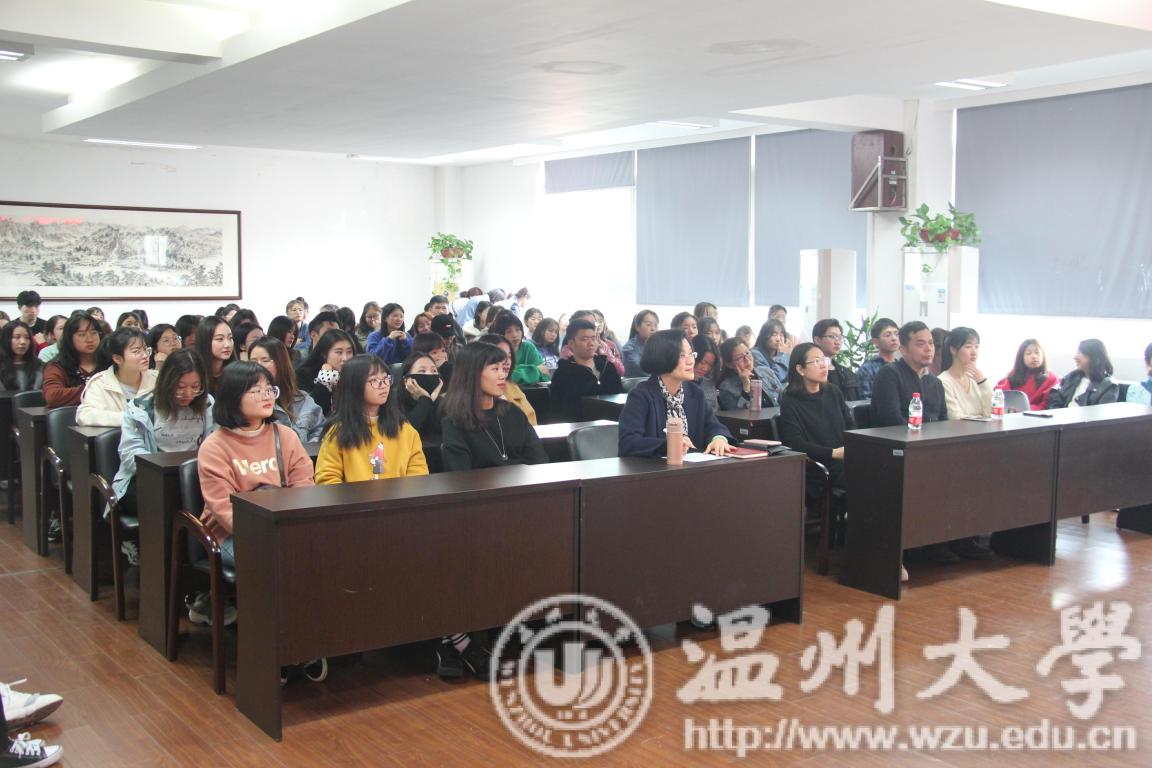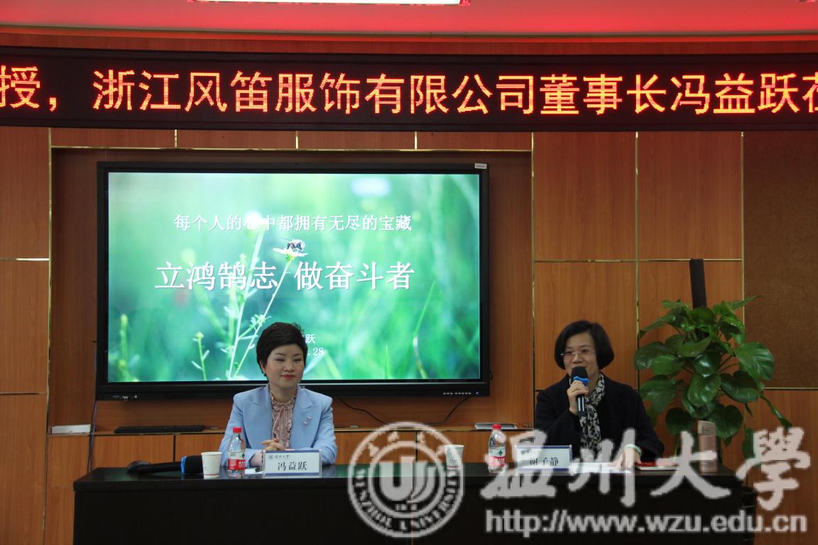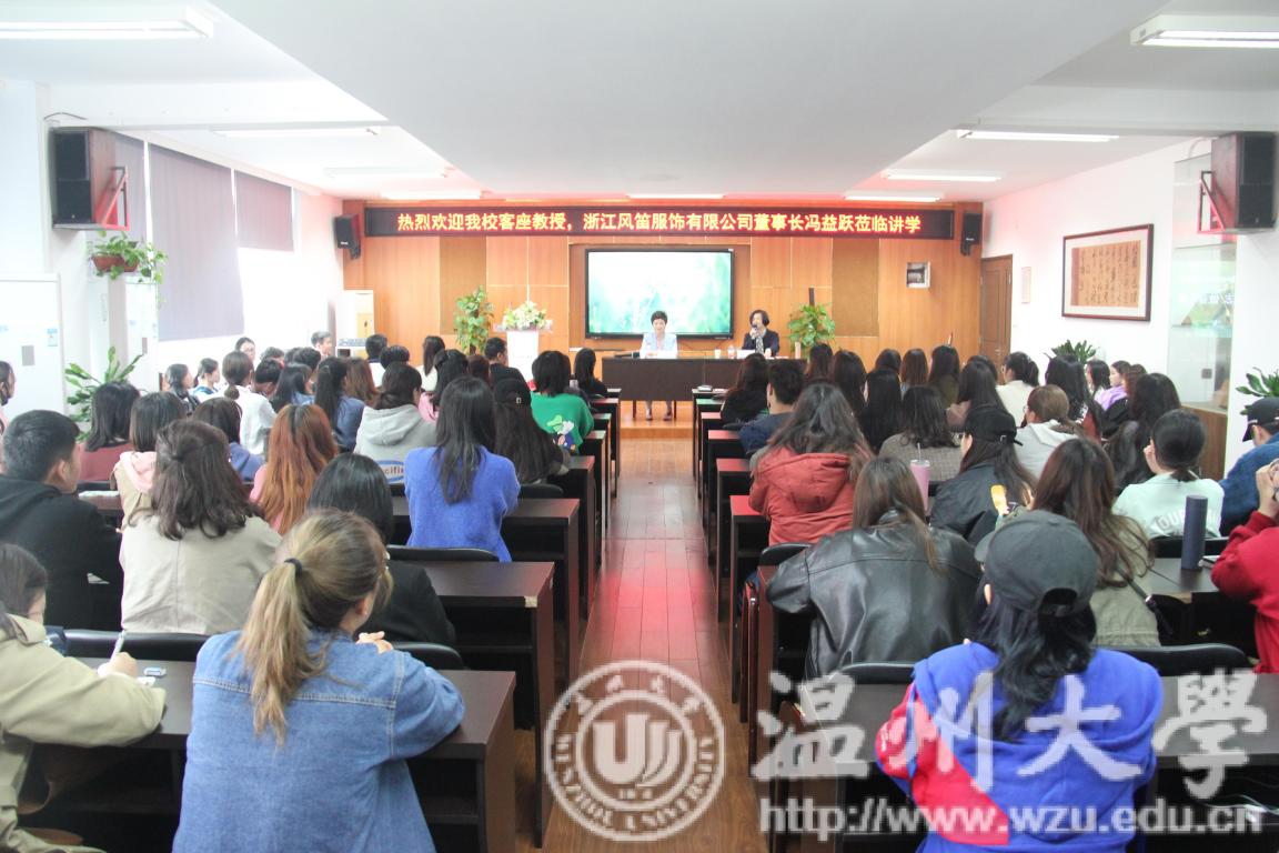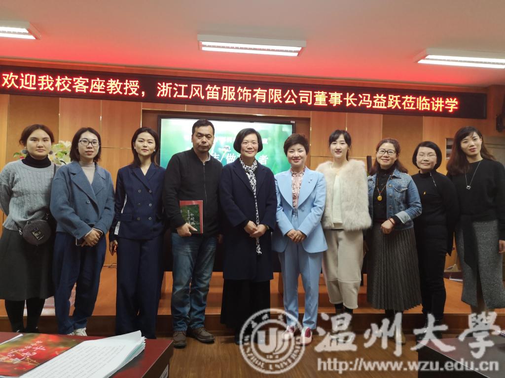 3月28日下午,公司客座教授、浙江风笛服饰有限公司董事长冯益跃女士莅临公司讲学,主题为《立鸿鹄志,做奋斗者》,公司经理李运河教授、副经理谢子静教授、员工科科长叶筱卉、服装与服饰设计教研室主任钟信群以及相关专业教师和员工参与观听,全场座无虚席。公司副经理谢子静教授主持。 讲座主要围绕心、道、德、事四个层次,分别讲述冯董自己个人的创业史以及有关励志教育,案例生动形象,内容深入浅出,她以平实亲和的语言教导在座的莘莘学子,要立鸿鹄志,勇做奋斗者。充分展现了一个无私无我、奉献社会的新时代成功企业家形象。 在为时两个半小时的讲座结束后,同学们热情不减,积极互动提问,作为公司客座教授的她均一一热情予以解答。会后,与会成员合影留念。