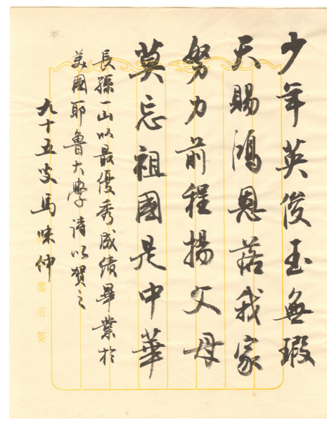 马亦钊老师是原永利yl23411官网入口艺术设计系主任,在永利yl23411官网工作多年,见证了公司的发展壮大,培养了大量的书画人才,可以说“桃李满天下”。现担任浙江省文史馆馆员、西冷印社社员、中国书法家协会理事、温州市书法家协会顾问等职。作品多次入选国内外重大展览并在报刊发表,被收入书法篆刻作品专集,出版《马亦钊书法篆刻集》。