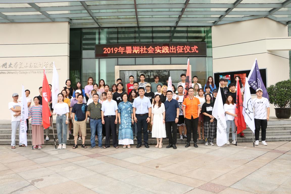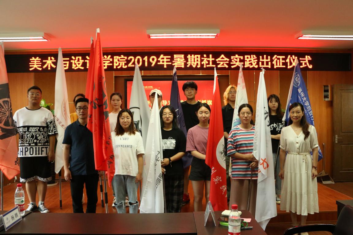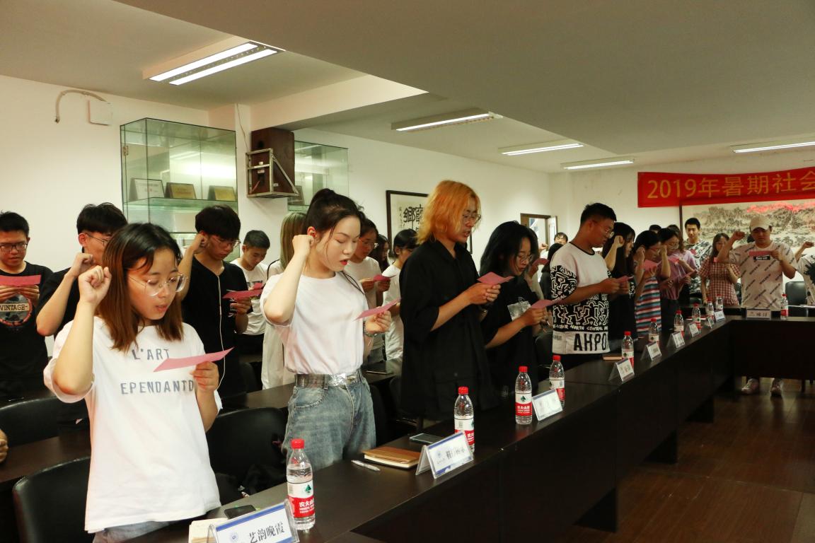 出征仪式全体宣誓,由2019年暑期社会实践员工代表崔泽渝领誓,全体同学宣誓,在庄严的誓词面前,同学们将更加坚定暑期社会实践的责任和信心。最后,公司领导为每个实践队授旗,本次活动也在美院正门的合照中,圆满画下了句号。