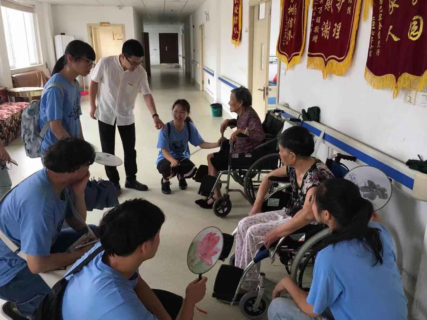 由于二楼的老人在睡觉,胡经理分别看望慰问了一楼和三楼的老人。看到队员们和一些可以表达的老人聊家常,胡经理也饶有兴趣的和老人交谈,关心他们日常的生活。老人们也很愿意和队员们聊天,一位老人聊自己的子女,满满的自豪感,讲到自己的子孙在国外,之前家里给请保姆,不过照顾不好,所以来了这里。还有位很和蔼的老奶奶,一直笑着,还很亲切的关心我们,问我们吃饭了没。还有一些队员给手脚不好的老爷爷按摩搓手,一位老爷爷有中风,护理阿姨做了拉伸运动后,老爷爷痛得捂着手,队员们见状便给老爷爷搓搓手,缓解疼痛。实践队员们一边关心老人,一边也把自己做的扇子送给老人,聊表心意。