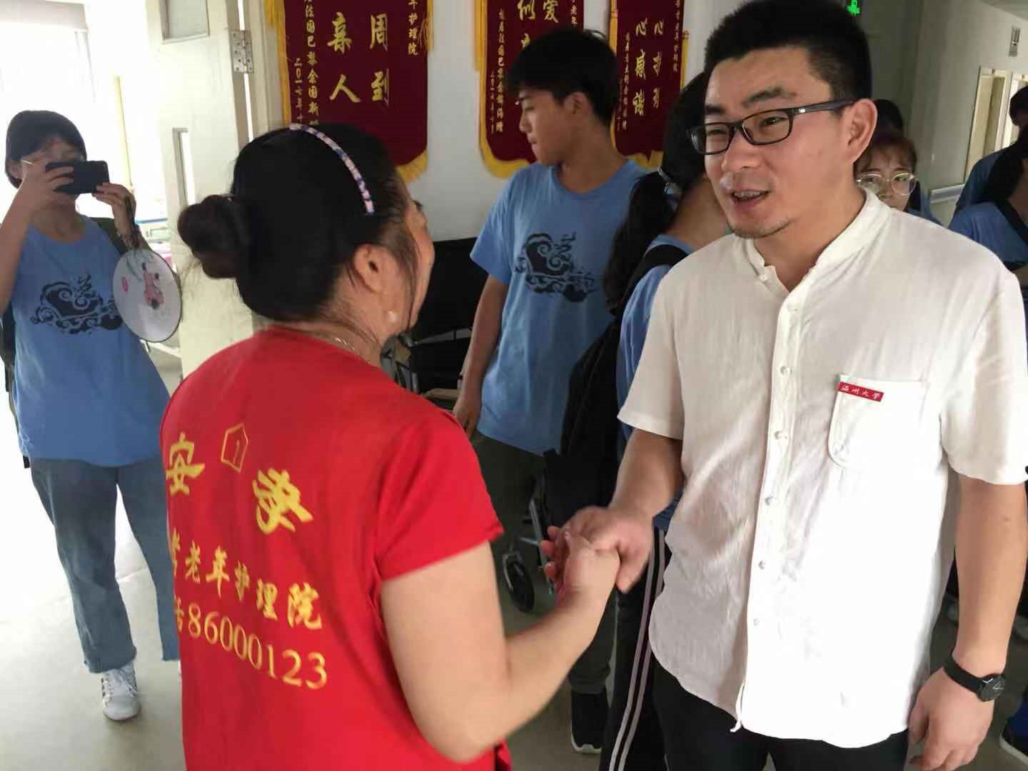 2019年7月18日上午九时许,永利yl23411官网副经理胡文超慰问了正在温州安孝老年护理院关爱老人活动的“艺韵晚霞”暑期社会实践队。初到敬老院,胡经理一行受到实践队员的热情欢迎,通过和队员们简单的交谈后,胡经理进入敬老院里,和敬老院里的护理人员详细了解敬老院的基本情况。