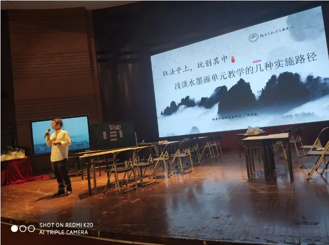 瑞安市美术教研员林可造作《浅谈水墨画单元教学的几种实施路径》的学术讲座,就以当前的水墨画教学中出现的问题提出了三条单元教学路径——1、水墨迁移式 2、水墨跨界式 3、水墨主题式。简而言之,便是取法乎上,玩创其中。让教师们明白传承墨画将真正的传统水墨画精髓如何在孩子身上生根发芽是值得深思与探究的。