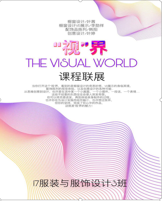 2020年11月30-12月8日,由叶茜老师、李勋祥老师、韩阳老师、叶婷老师指导的17服装与服饰设计3班橱窗设计课程、橱窗设计VR展示课程、配饰品陈列课程、创意设计课程四课程联展在永利yl23411官网教学楼一楼大厅展出。展出的一件件作品,不仅充分展现了班级同学的专业能力,而且有力体现了美院的艺术风采! 当你打开这个“视界”,看到的是橱窗设计的奇思妙想、VR展示的身临其境、配饰品陈列的视觉体验以及创意设计的各种可能...... 从思维创意到设计,也许是生活中某一个小画面、一个小摆件、一段话、一个表情......这些不经意的东西,往往会使人突发奇想,你可以将灵感迸发,再到体验亲身制作的过程。也许你在为设计实施而绞尽脑汁,也许想过放弃,但你依然坚持完成了你心中的作品,这就是“视界”的魅力。 此次展览一方面是为了向全公司展示我们陈列展示班级的学习成果,传播我们独特的课程文化;另一方面也是希望能与其他相关班级的同学老师们进行艺术交流,一同品味。 课程展出当天,引起了不少老师和同学们驻足,停下脚步欣赏的作品。通过这次课程展览,不仅仅让更多的同学们了解服装展示设计方向专业重要性、独特性、趣味性,也让大家都看到并认可同学们的专业能力和专业水平,更是提供了师生们互相交流的平台。同学们也因此领略到橱窗设计的魅力与理念,开阔了自己的眼界,欣赏了不同的课程文化。 (材料提供者:王欣雨)