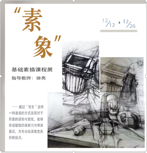 2020年12月12-26日,题名为“素象”的课程联展在永利yl23411官网一楼展厅开展,集中展示由徐亮老师指导的20级设计五班与20级研究生学科教学美术班的基础素描教学成果。