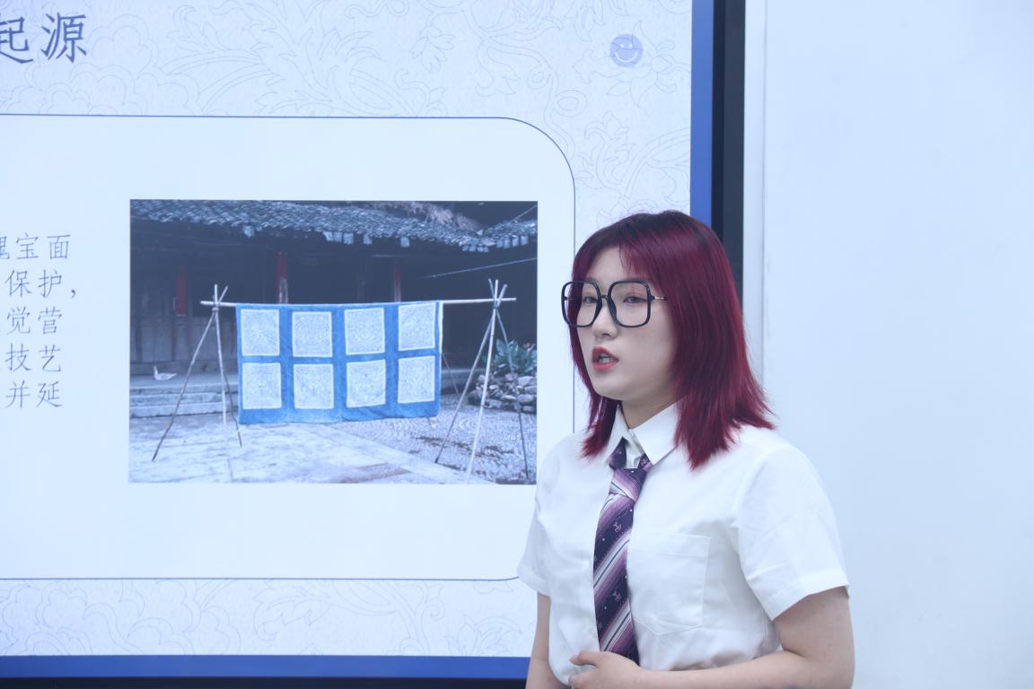 第一位参赛者的演讲是以非遗夹缬为主题的工作室规划,在与评委老师的探讨中,老师问到:“你认为怎么样才能让夹缬更突出,更有竞争力呢?”参赛员工认为,夹缬的色系以蓝白为主,特殊的材料配饰撘配,充分体现了夹缬的独特性,同时非遗也是工作室的一大亮点。这段条理清晰的答辩也大大得到了评委老师的赞赏。