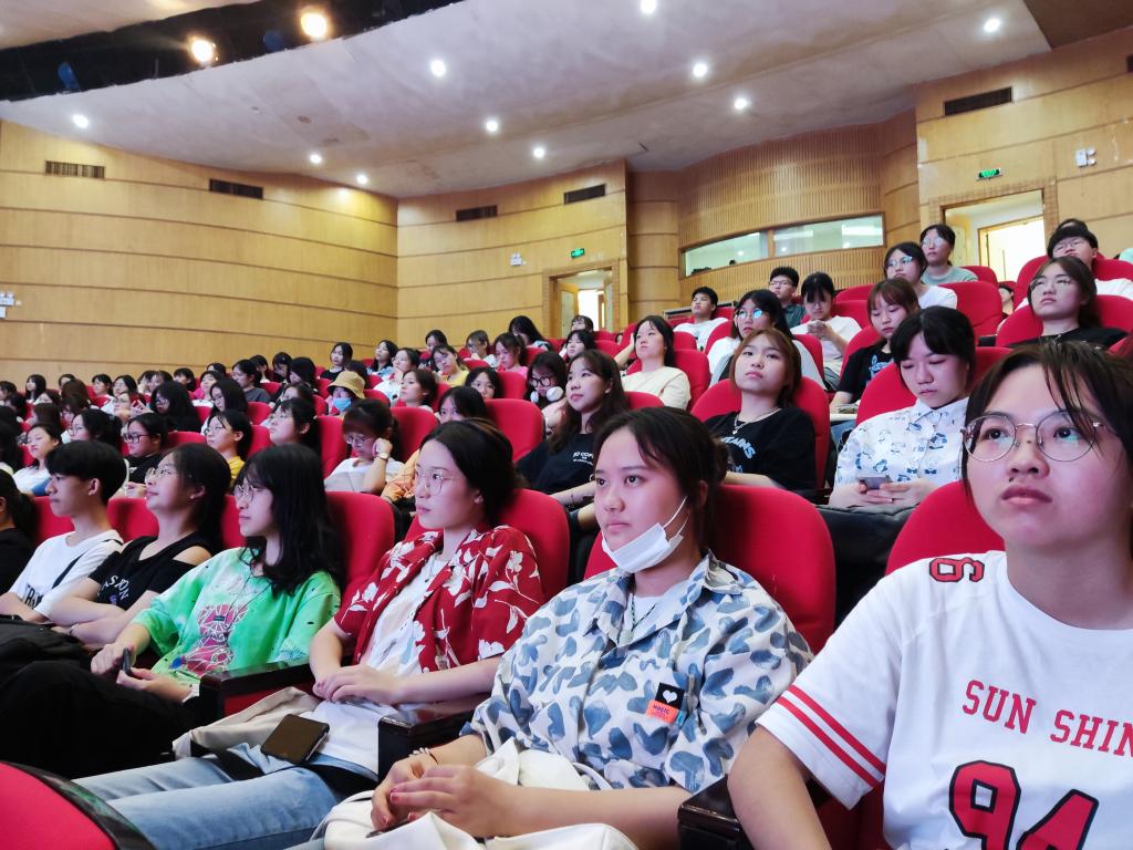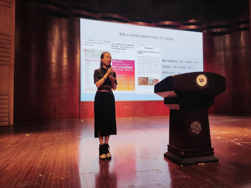 服装与服饰设计系主任金晨怡老师与教研室主任祝忠良老师分别对服装设计、服装展示设计、鞋履与饰品设计3个专业方向进行了详细的专业分享与就业前景的介绍,并详细讲解了历届优秀的学长学姐的毕业作品。
