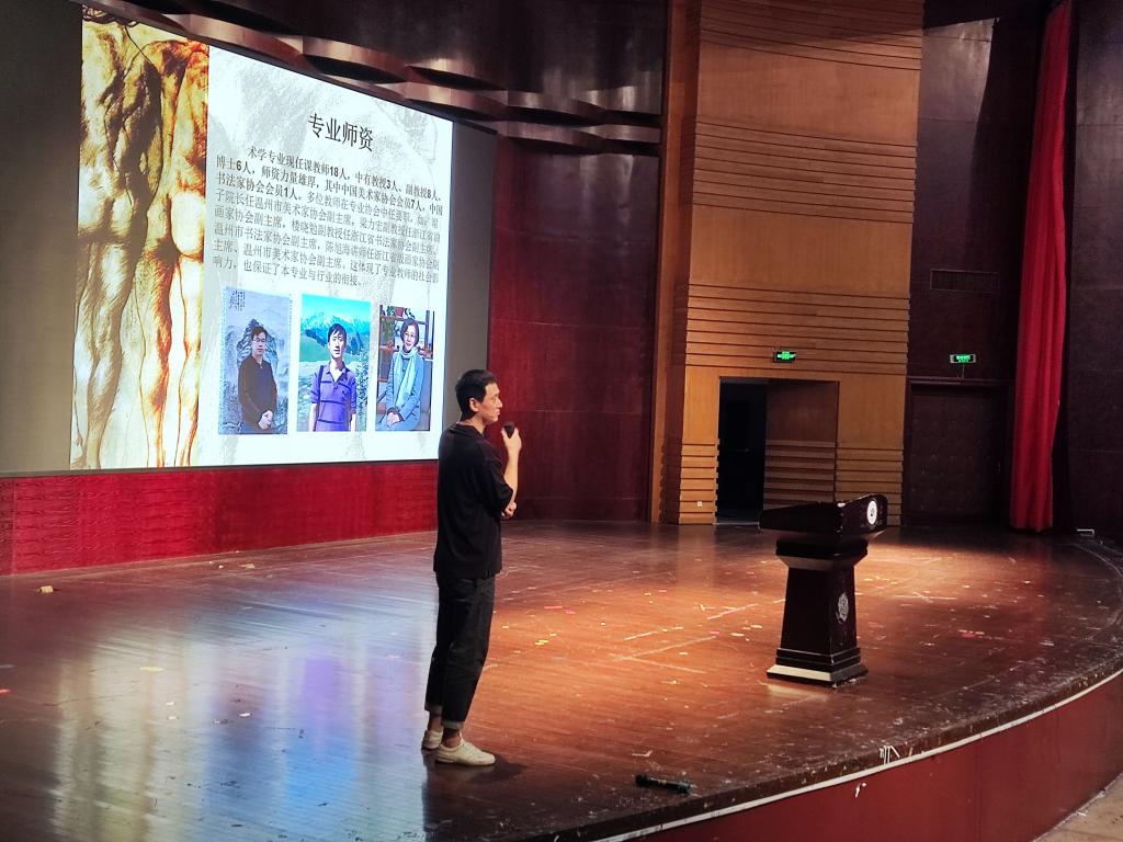 美术学(师范)系主任陈旭海老师详细讲解了美术学(师范)悠久的历史与雄厚的团队力量,介绍了历届学长学姐优秀的作品,并对新生四年老员工活进行了分析与展望,并就专业下国画、油画、版画、书法四个方向进行了特点介绍。